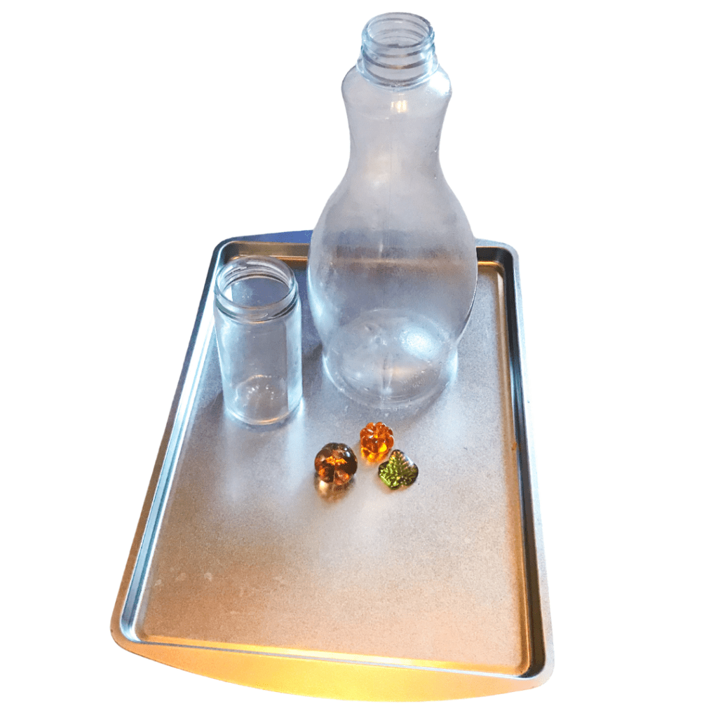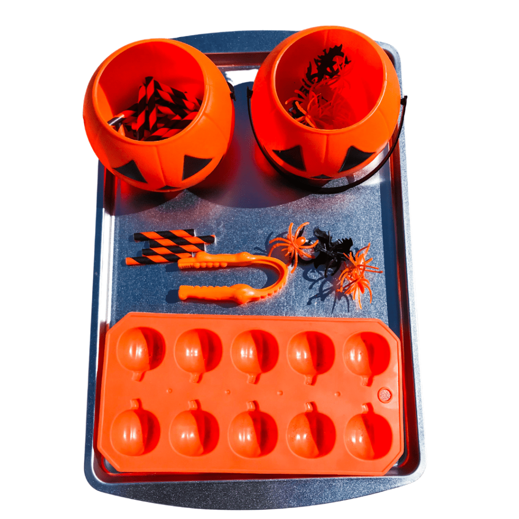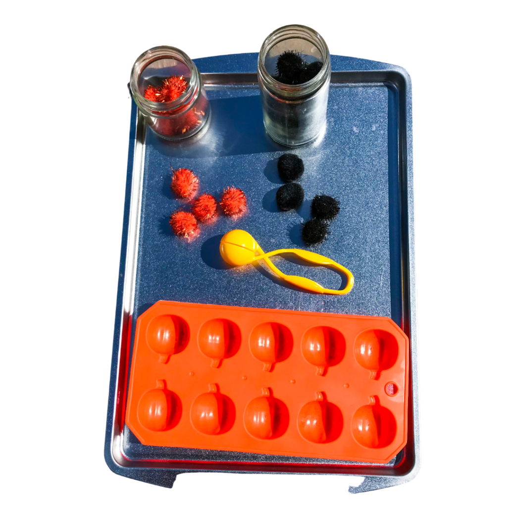 This tray is a two for one! You can have your older toddler sort the pom poms by color into the jars using the squeeze tool or fingers, she could also fill the pumpkin tray using the tool. You could also use the tongs tool.