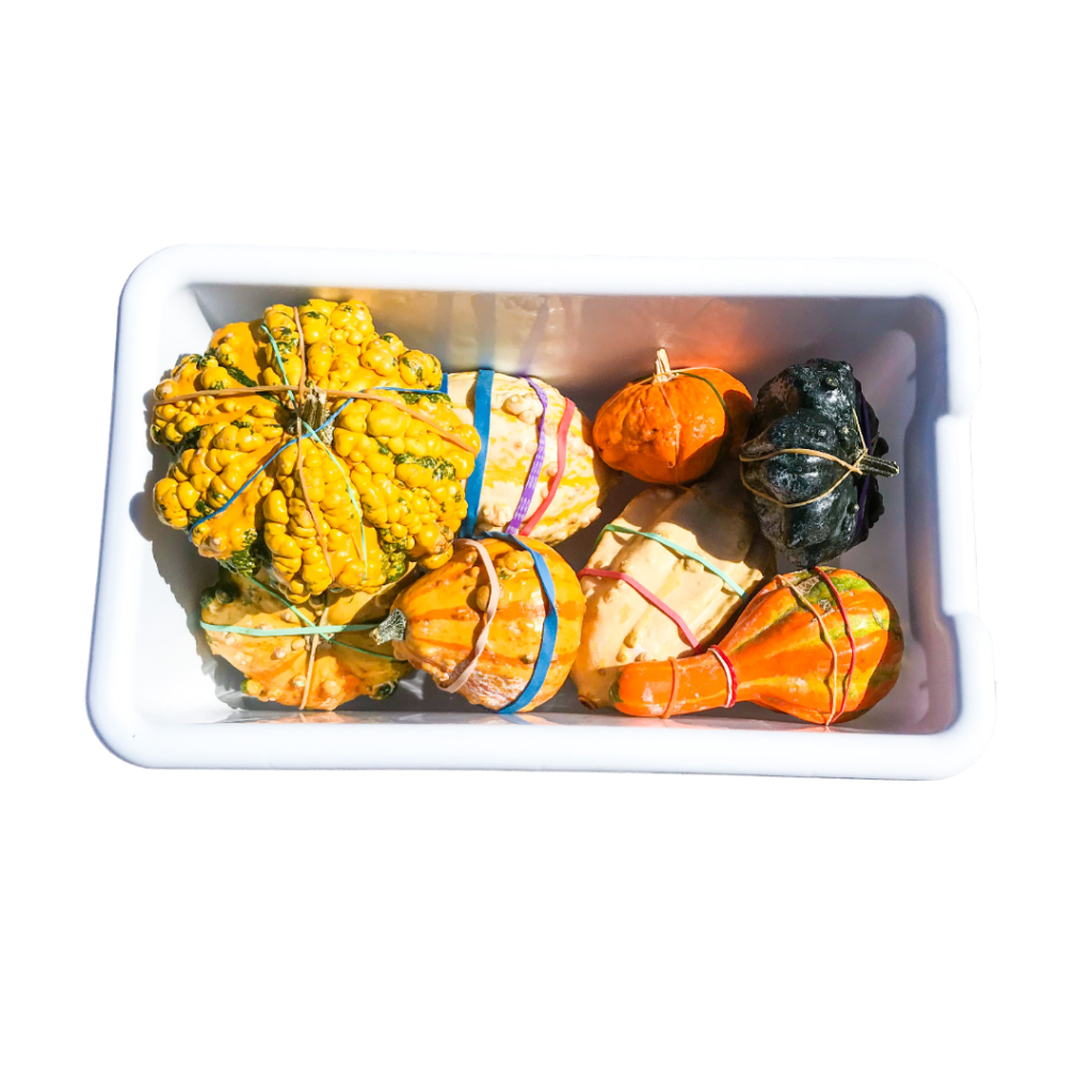 I love this activity so much. Simply place rubber bands around your pumpkins and have your toddler remove them. Older toddlers may be able to put the rubber bands back on as well. This tray is endless!