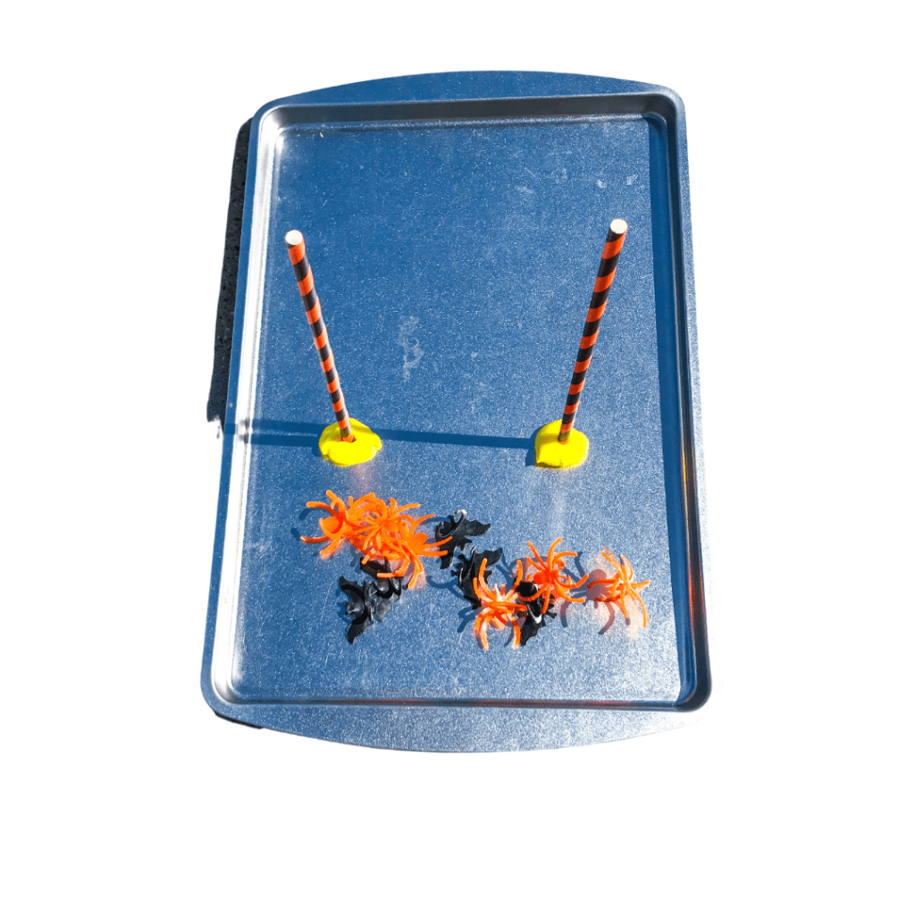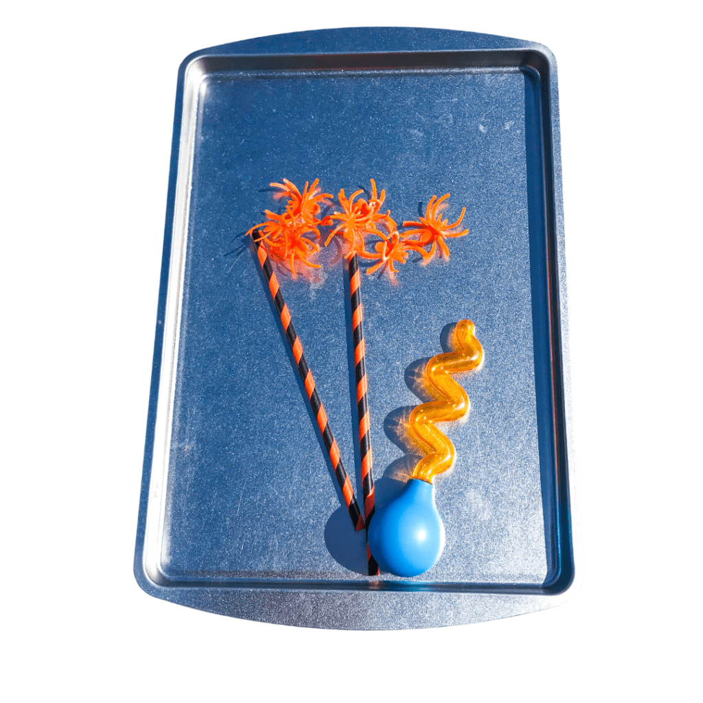 Many years ago, one of my buddies was in speech therapy. The therapist came up with this fun idea to engage some unused muscles in my charges mouth. She taught us this game where we would use straw to blow objects across the floor using our breath. It was so much fun! We would tape down a large square on the floor and challenge each other to push spider rings outside or inside the square. I’ve added the water tool as well to this tray to use as an air blowing device!