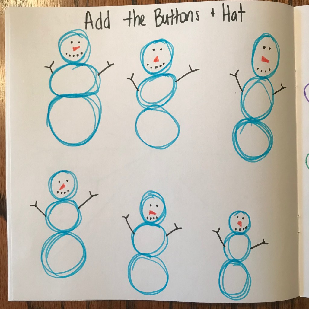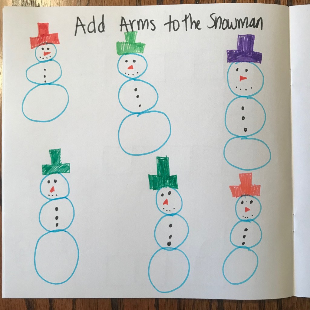 E will continue to work on her mark making and straight lines by adding arms to the snowman. Pretty simple!