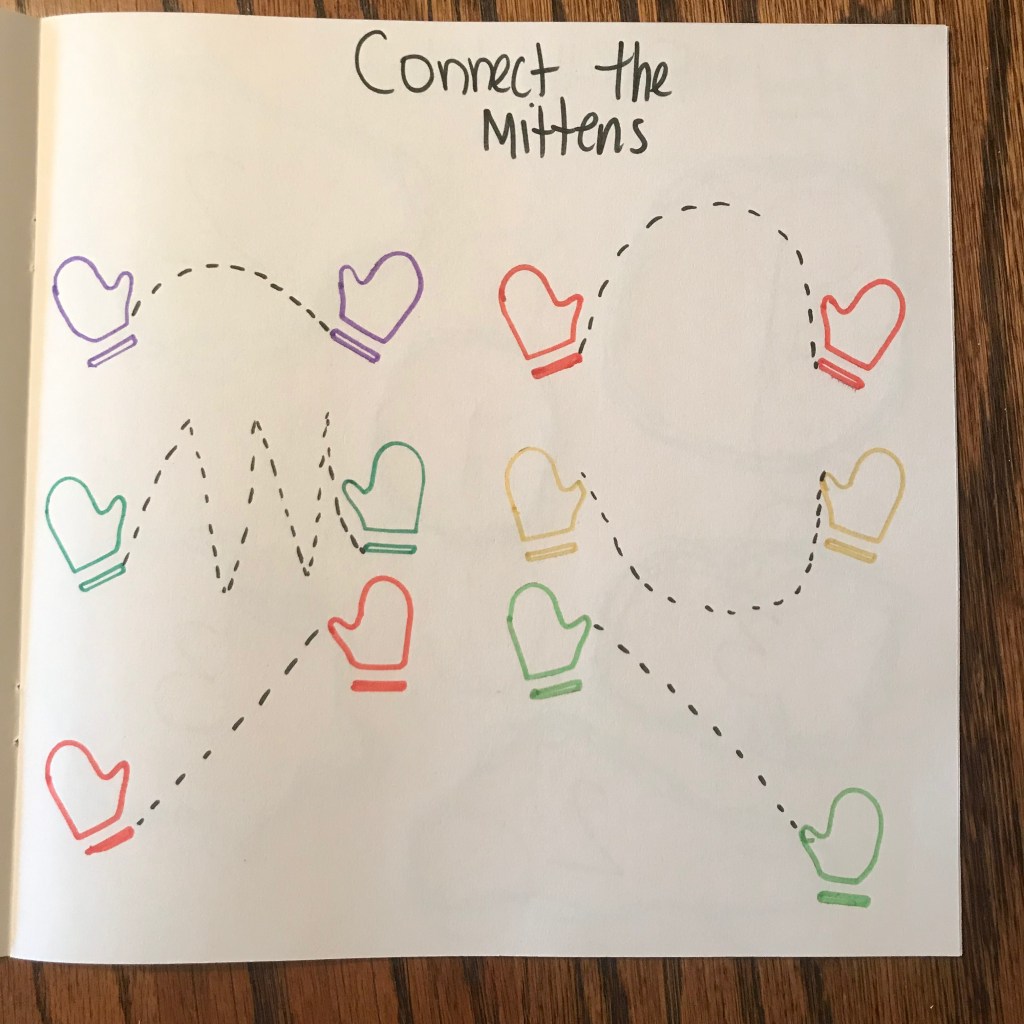 One of the most important parts of pre-writing and pre-reading skills is mark making. While a child is using her fine motor skills to work a writing tool she is also working skills needed in reading and writing like, moving left to right and top to bottom. This also helps her to cross the midline. E will use a variety of writing tools to trace the lines to connect each mitten group. Whenever we do this activity she picks four different colors and continues to cover each line over and over! This is definitely a favorite.