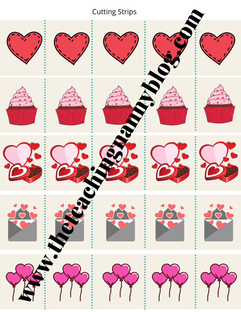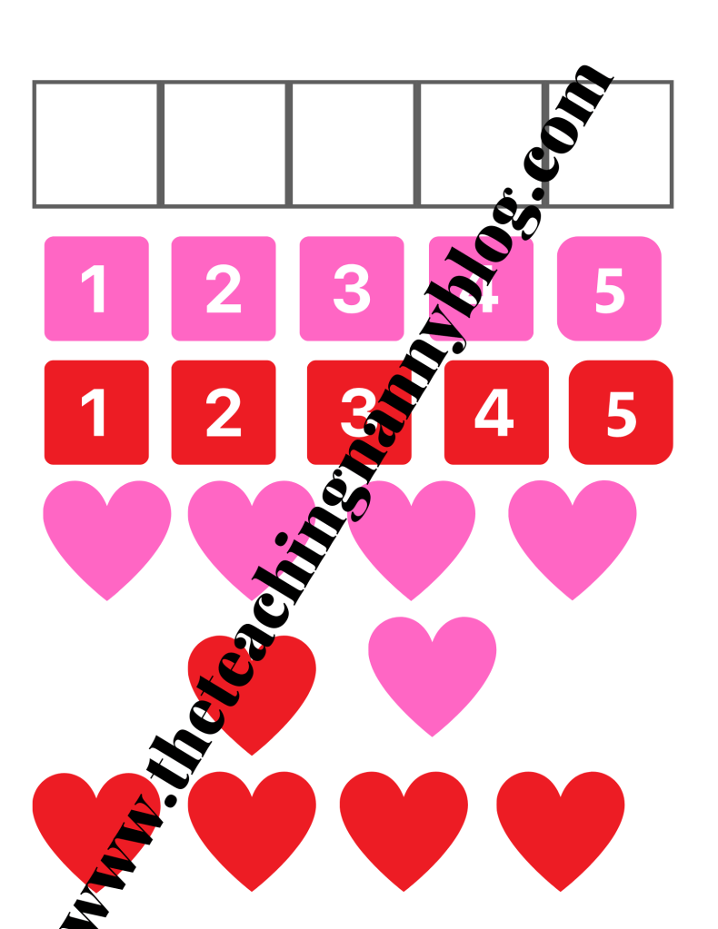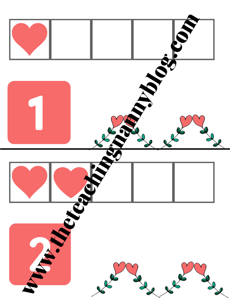 The second set of five frames will be perfect for a child just learning to match a set of items to a number. This set has the correct number of hearts already in the frame. Have your child use small hearts or counters to cover and cut the hearts. Because the visual is already there, this set makes for a complete independent activity.