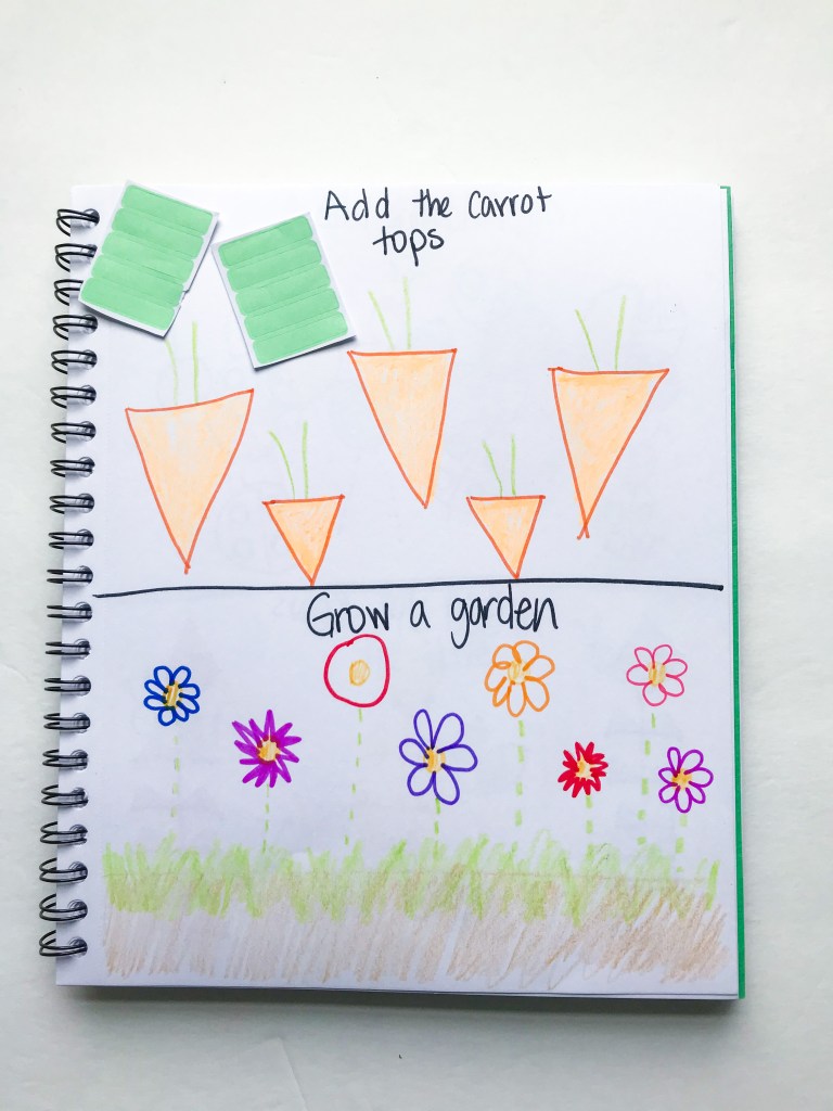 I love using carrots for spring time. In this page we’re adding green stickers to each top. Stickers are highly motivating for I. You could easily make this a counting and number recognition page by simply writing a number on the carrot and have your child draw the correct number of tops.