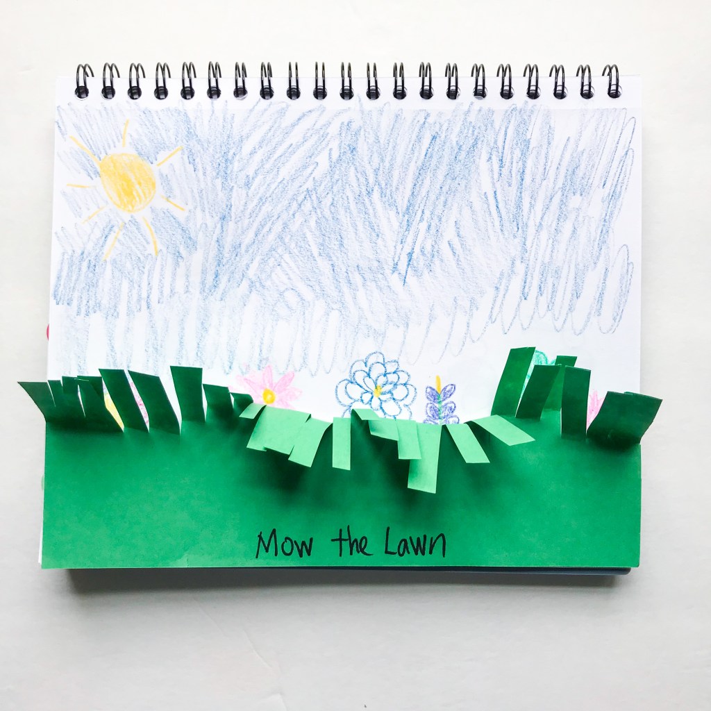 This is another one of those spring activities you see all over but is too fun to pass up! Under the grass, which is taped into the journal, are flowers that I will find once she mows down the grass with her scissors. I love a good cutting skills page!
