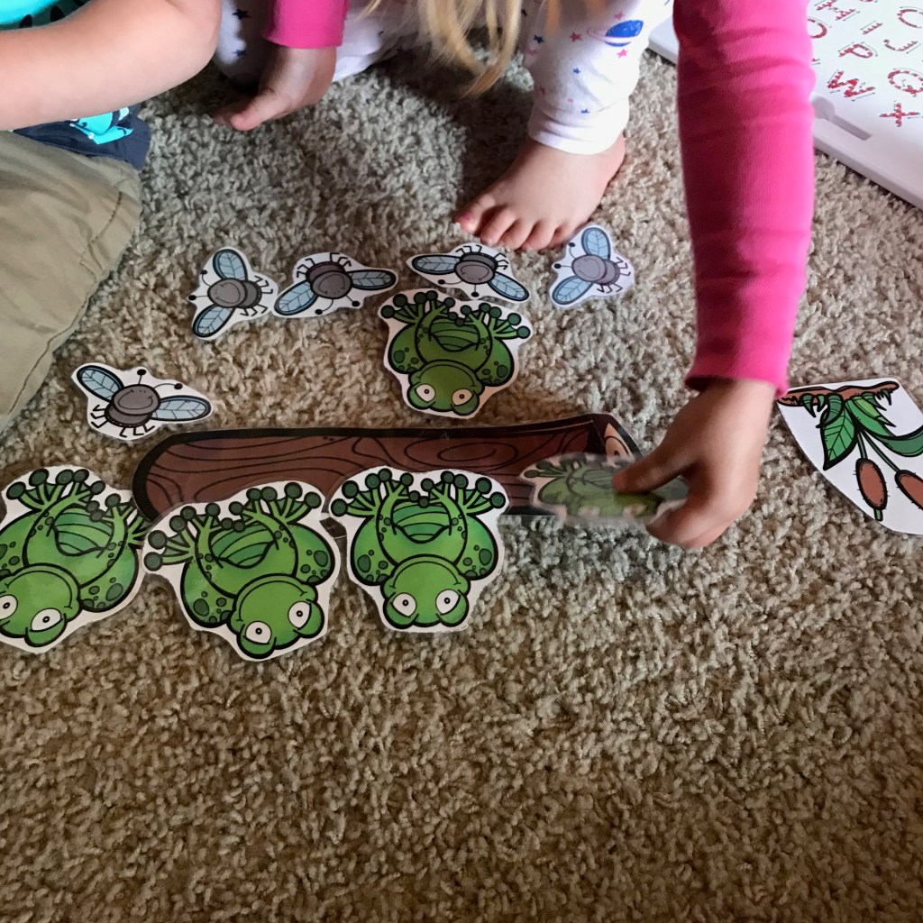 Here’s an example of a 5 Green and Speckled Frogs song basket being used. Since we have sang the song over and over, the kids are able to set up the scene to act out independently.