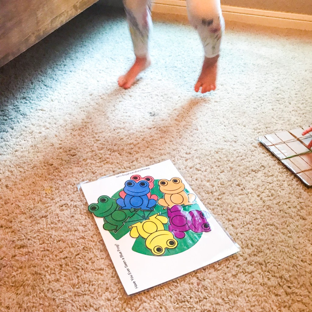 This is a new to me song called Have You Ever Seen a Blue Frog? Sung to the tune of Have You Ever Seen a Lassie, it is one of those piggy back color songs that kids love to sing over and over! Anytime you can add motions like hopping to a song it’s a winner for my friends!