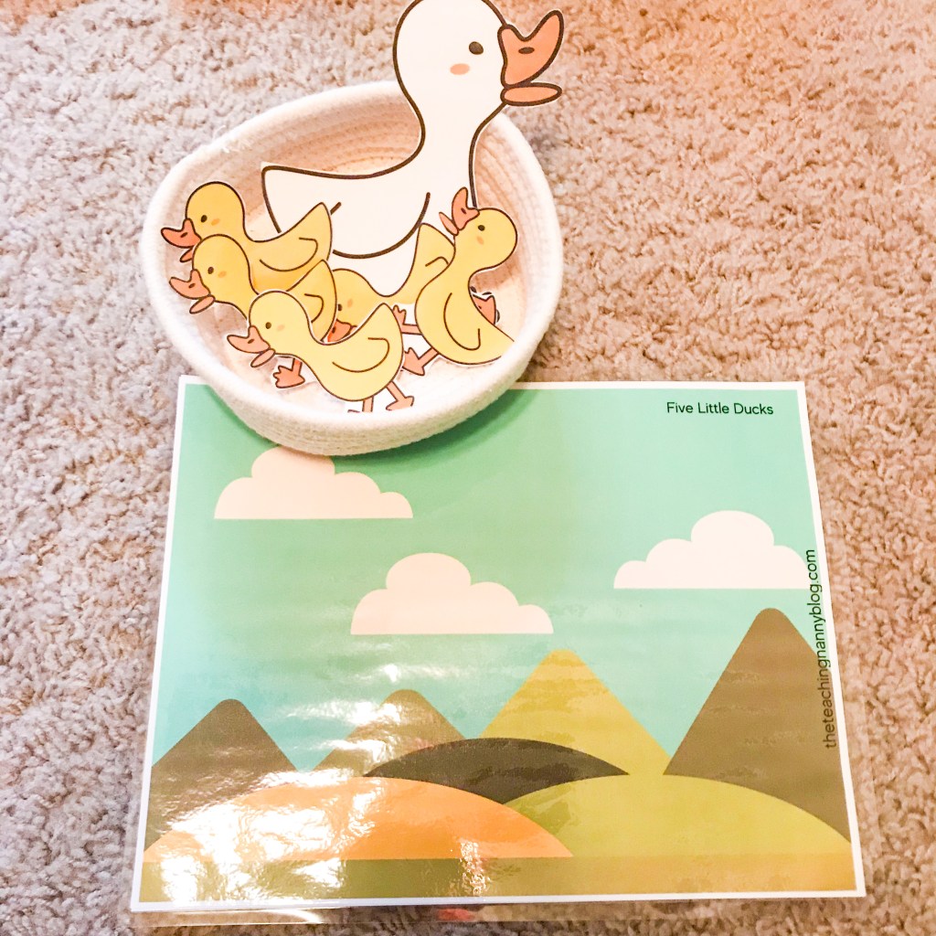 The sky is the limit! My charges are really into 5 Little Ducks (hence why its in the printable!)which is the perfect example of a counting song using a repeating pattern of removing ducks and bringing them back. You’ll also find a color song and animal noises song in this printable!