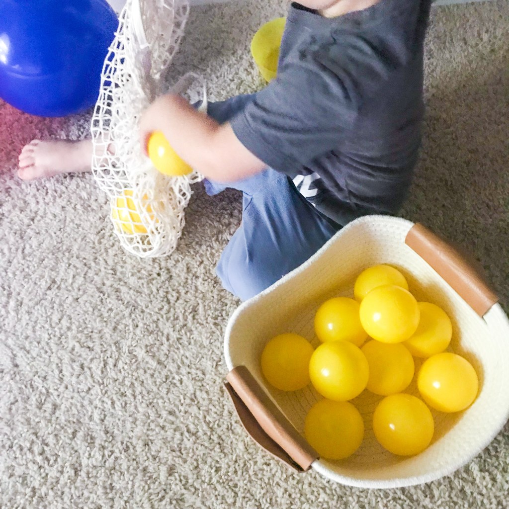 For a larger gross motor pollination activity, we’re using yellow ball pit balls. I placed them around the room for the kids to collect in a bag like a bee to bring back to the hive. You could also turn this into a race outside.