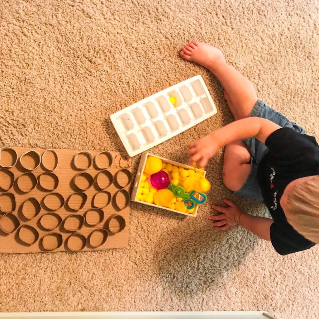 Reusing this DIY rainbow and yellow pom poms that I always have around turned into this new twist on a transfer activity. We are practicing being Pollinator bugs by moving pollen from one place to another! J decided himself that he needed the ice cube tray as well! I love toddlers thought processing.