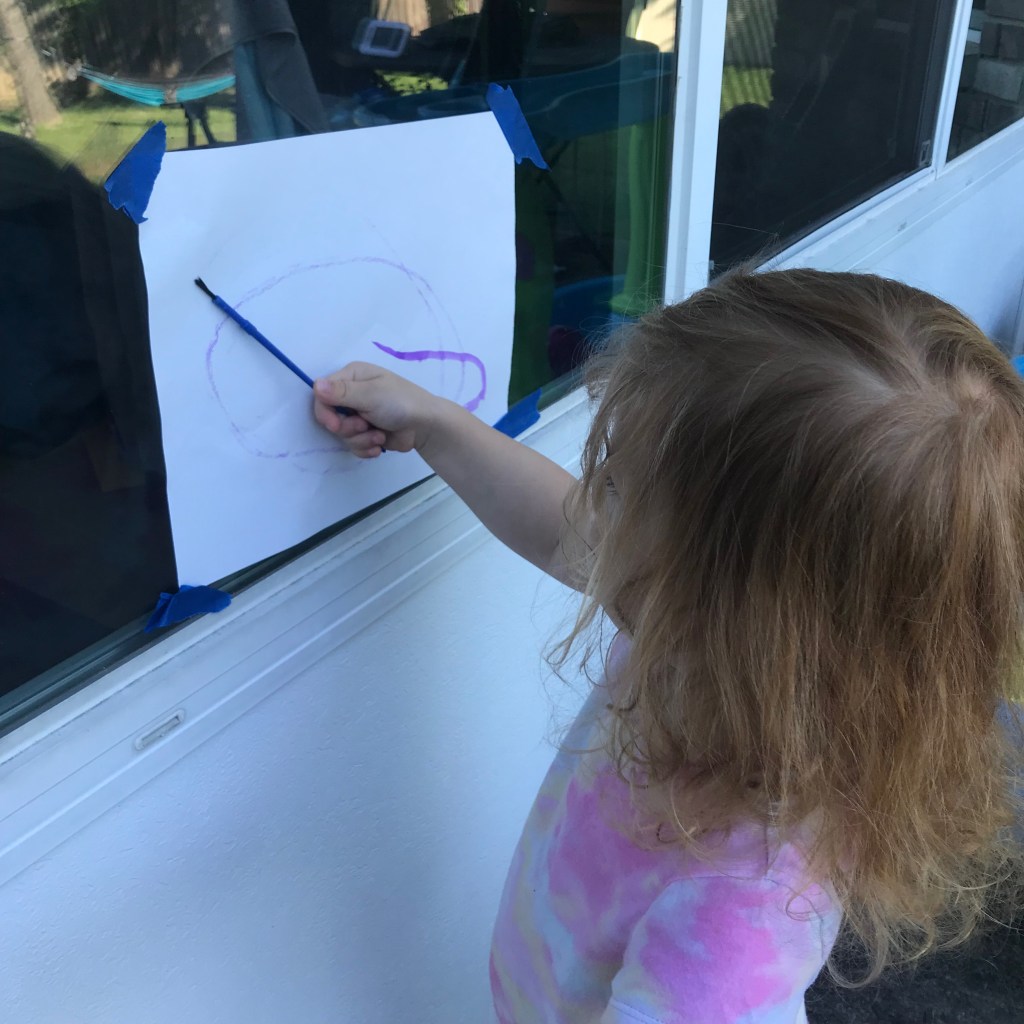 I love making big art pieces outside. Less mess, more gross muscle growth! Taping large paper onto a fence or wall equals a massive canvas which is also great for shoulder strength.