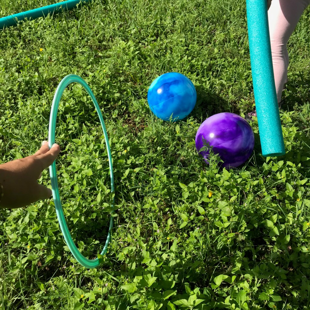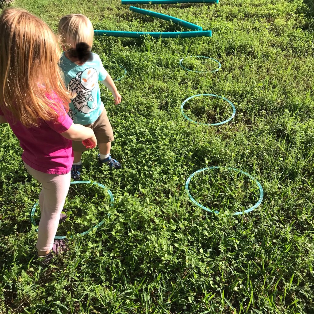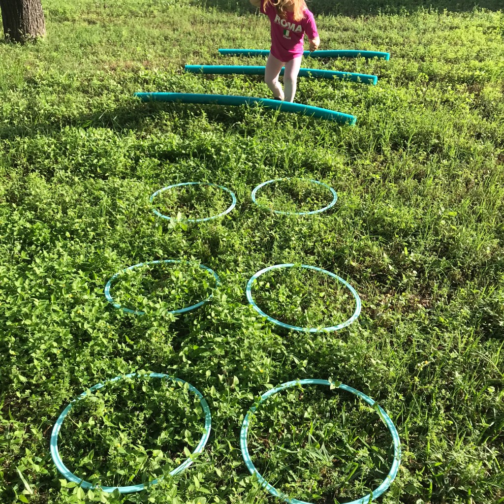 First up, we kept things really simple and classic. A good old fashioned obstacle course! This can of course be scaled for your children’s ages. We started with noodles on the ground to hop over and a few hoops to jump into.