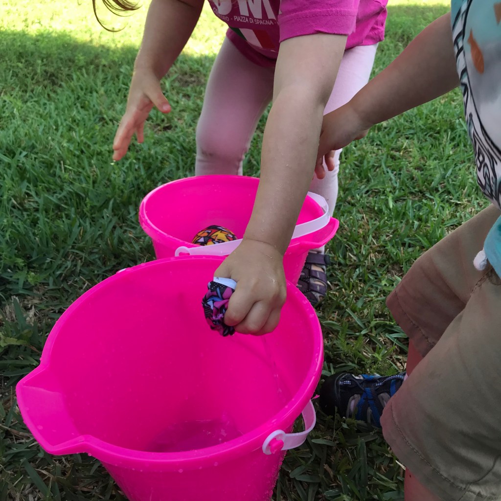 For some fine motor work, I put these squeeze balls into a bucket with water and showed the kids how to squeeze the balls into the empty bucket. This also makes a fund relay style race game. Have children run between the two buckets to see who can fill theirs the most before time is up!