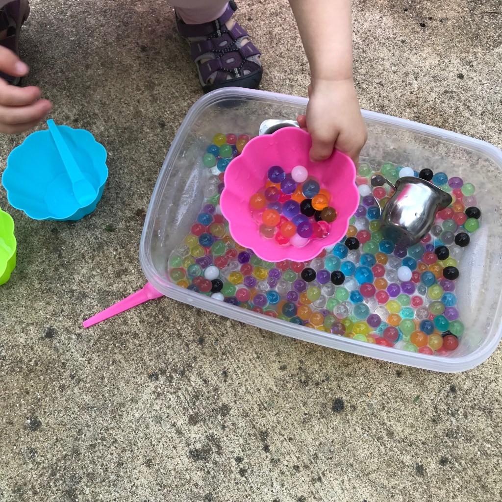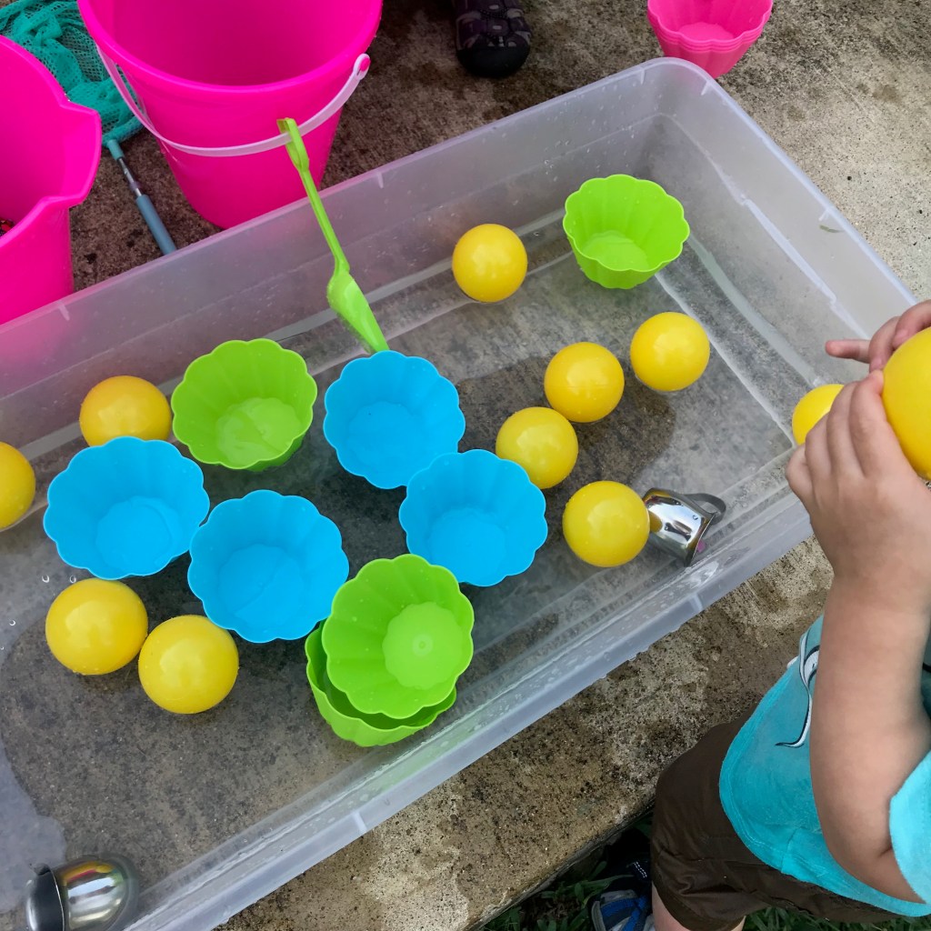 Onto the water fun! My nanny family does have a water table that we use often. I love using this long deep storage container for games because it’s big!