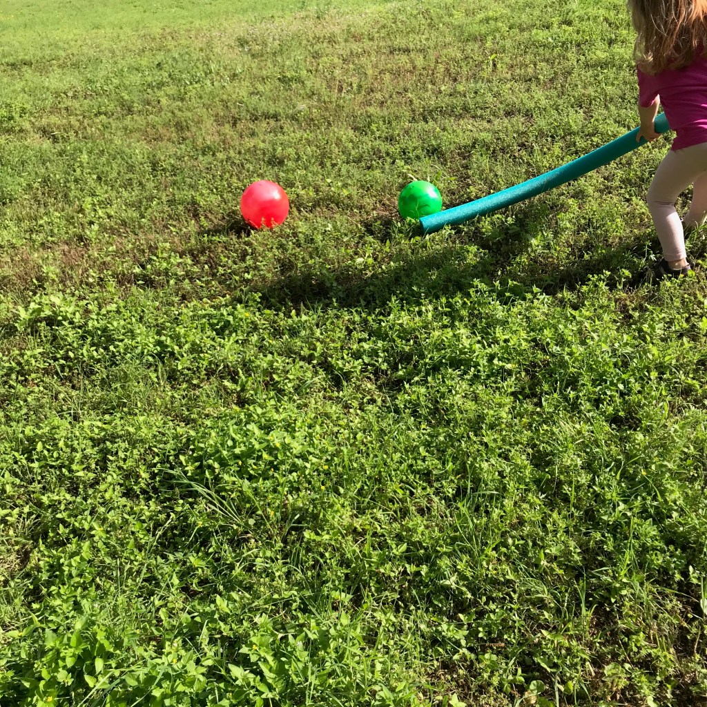If you want some good belly laughs, give your toddler a pool noddle and a ball to move around the yard!
