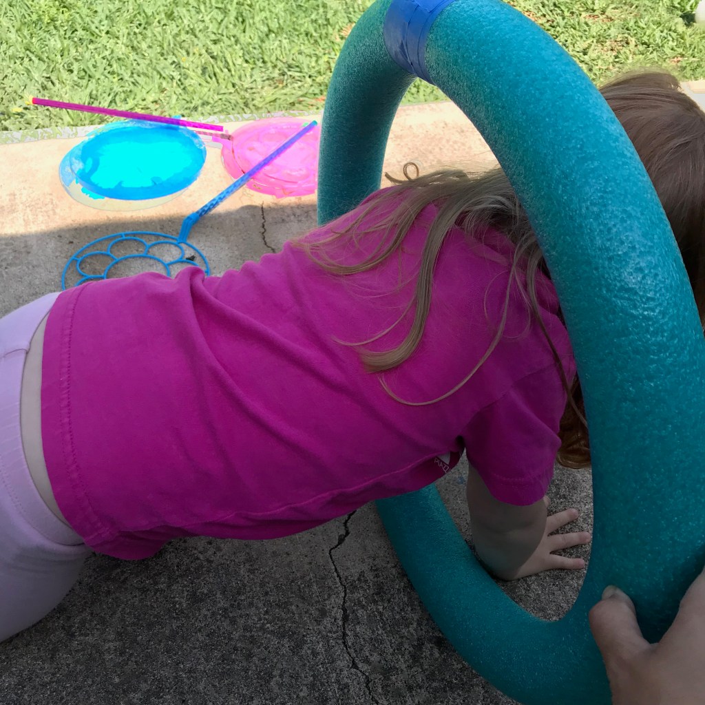 I turned a noodle into a hoop by just taping the ends together. This makes a great frizzbee! E wanted to see if she could fit through it!