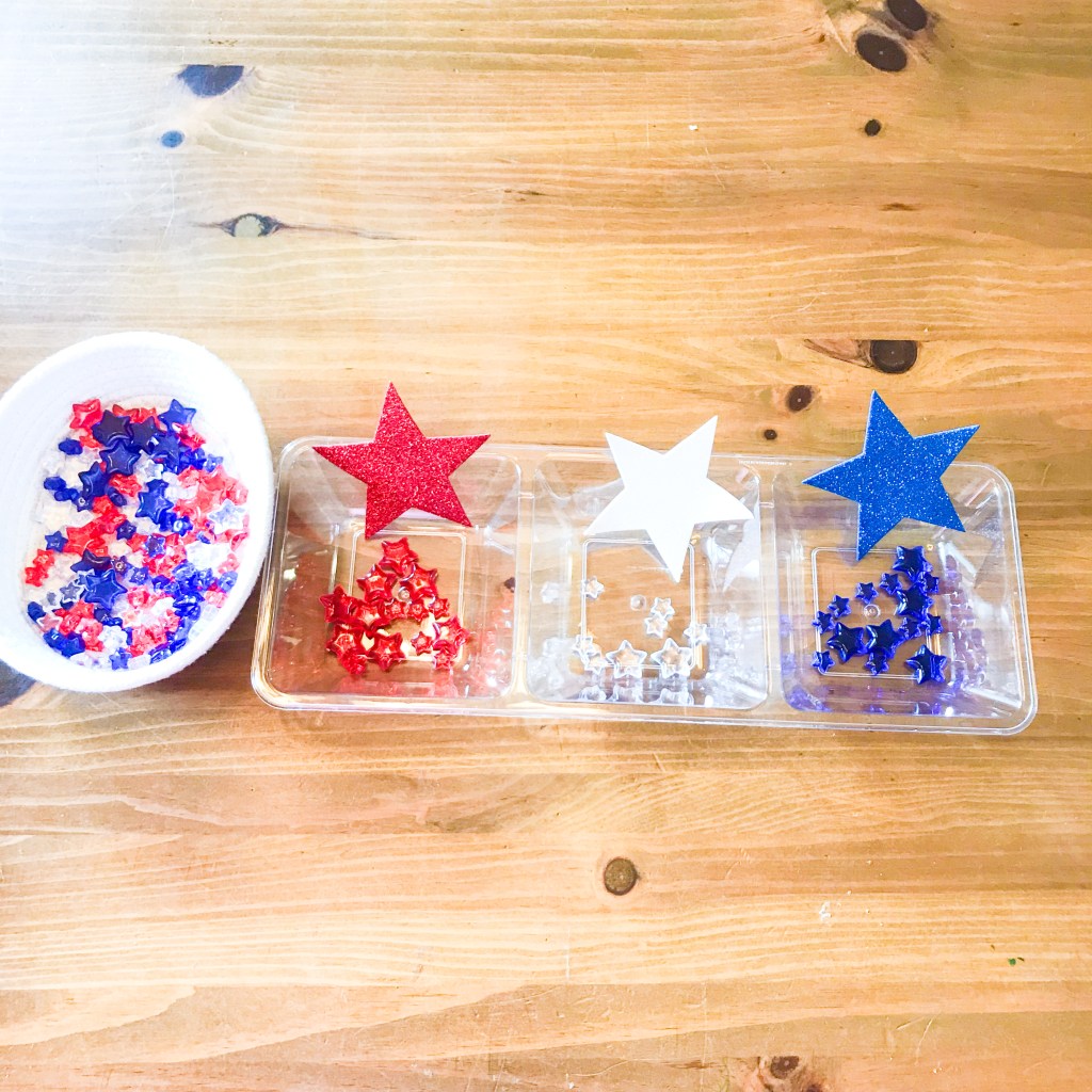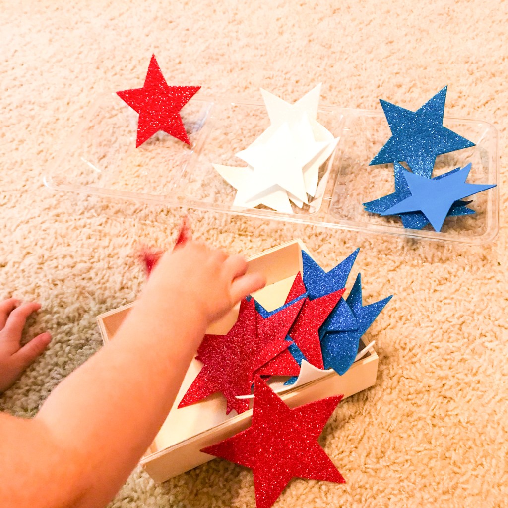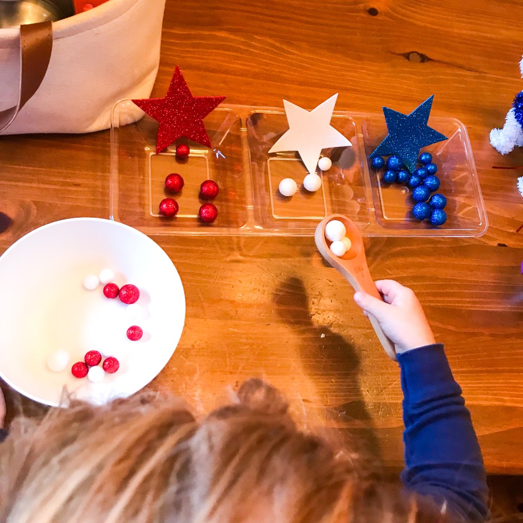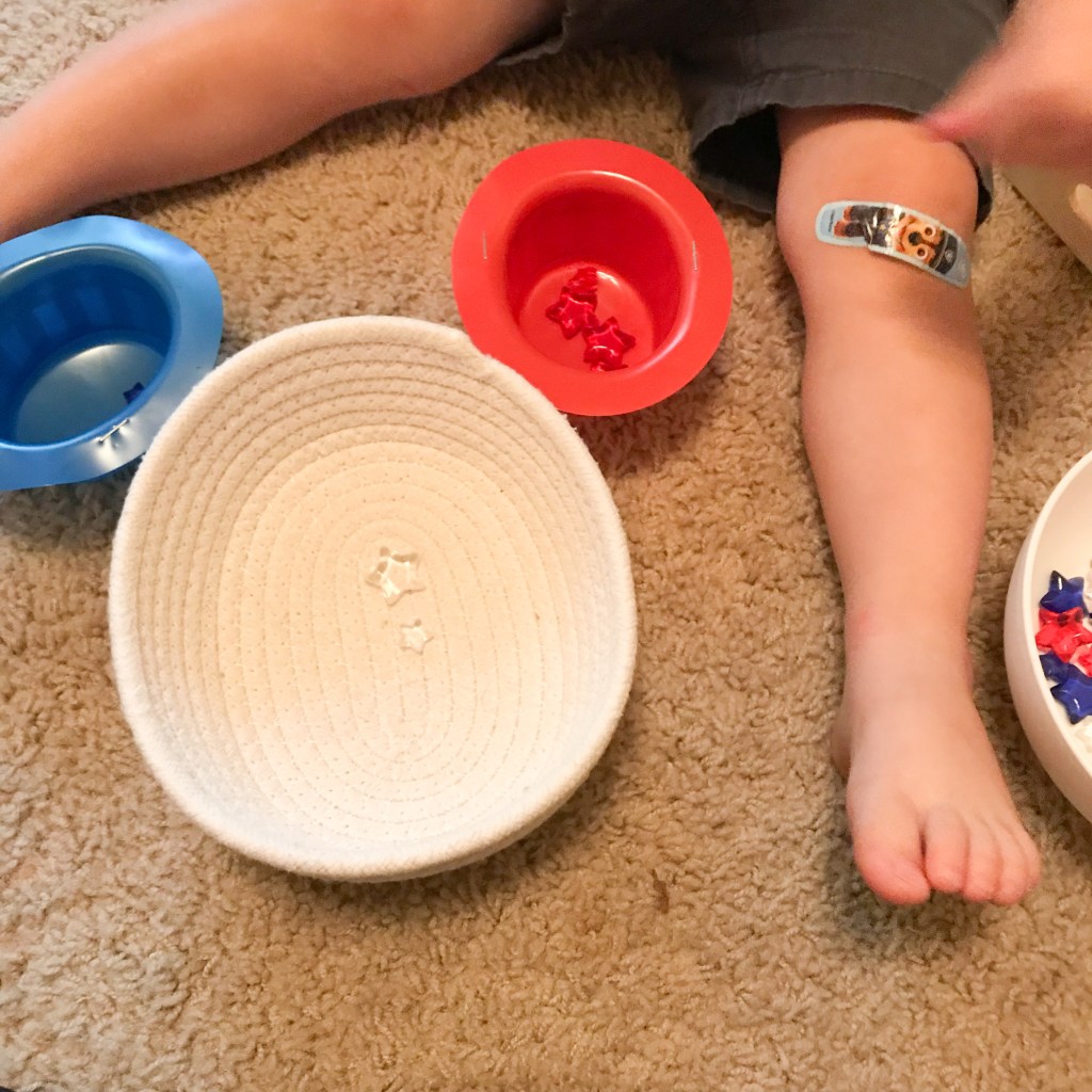 J is just beginning to notice the differences in colors which couldn’t have come at a better time. Most of these activities are sorting Red, White, and Blue. If you follow the Montessori method, red and blue are the first colors taught. Talk about perfect timing!