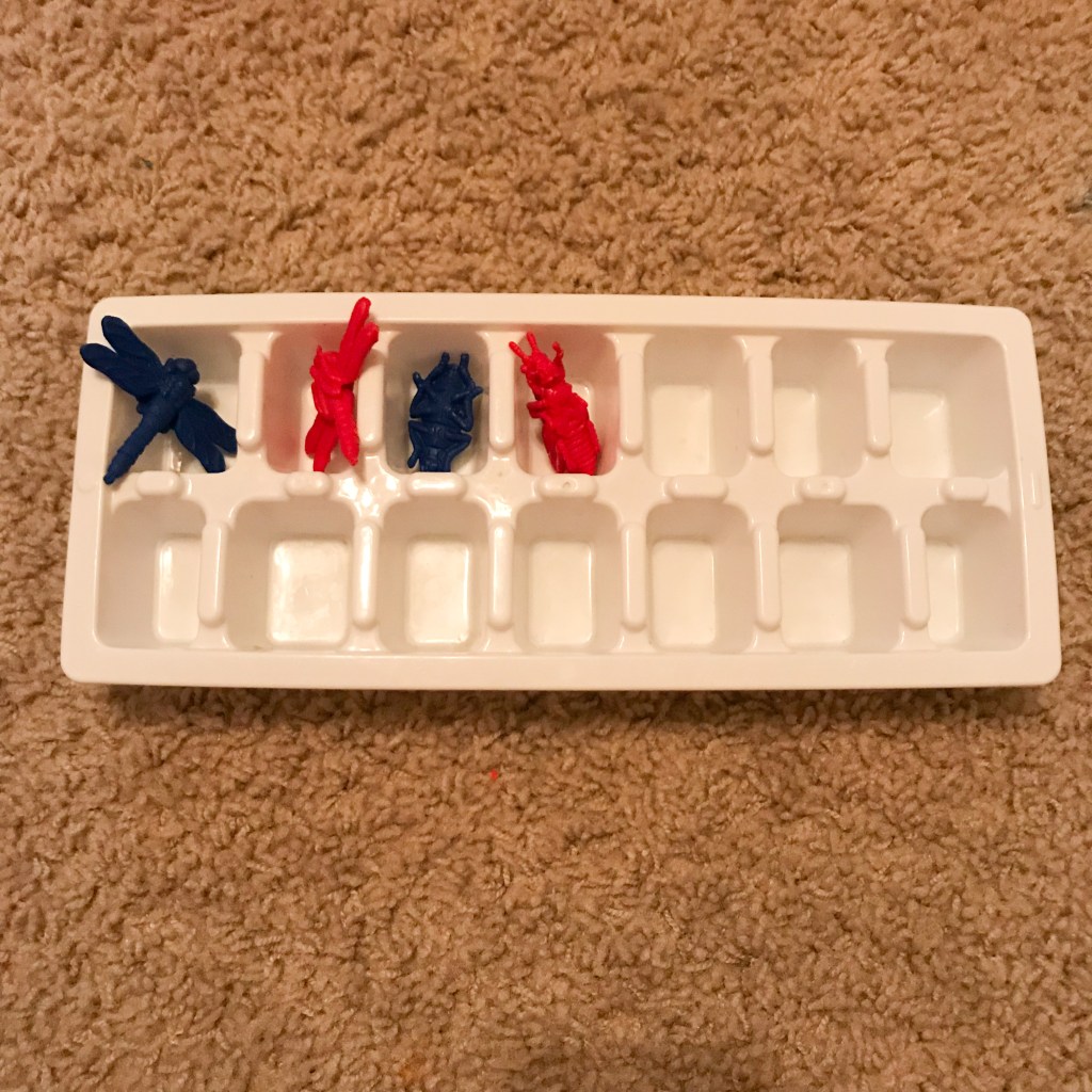 Working on simple patterns in an ice cube tray is a great way to introduce patterning to younger toddlers. I create a pattern in the top row and E copies it below mine.