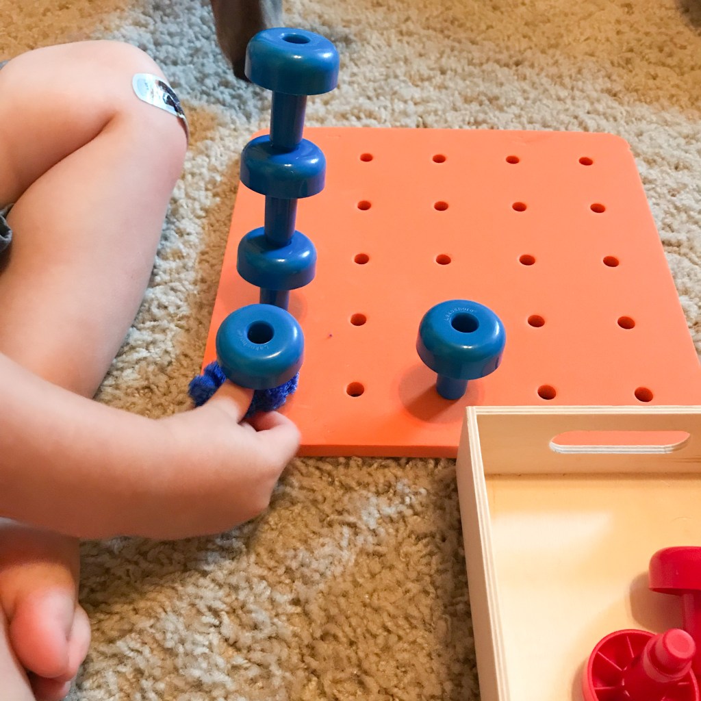 Making peg towers on the pegboard along with hair ties was a favorite during our rainbow unit. The kids were excited to see these back into rotation.