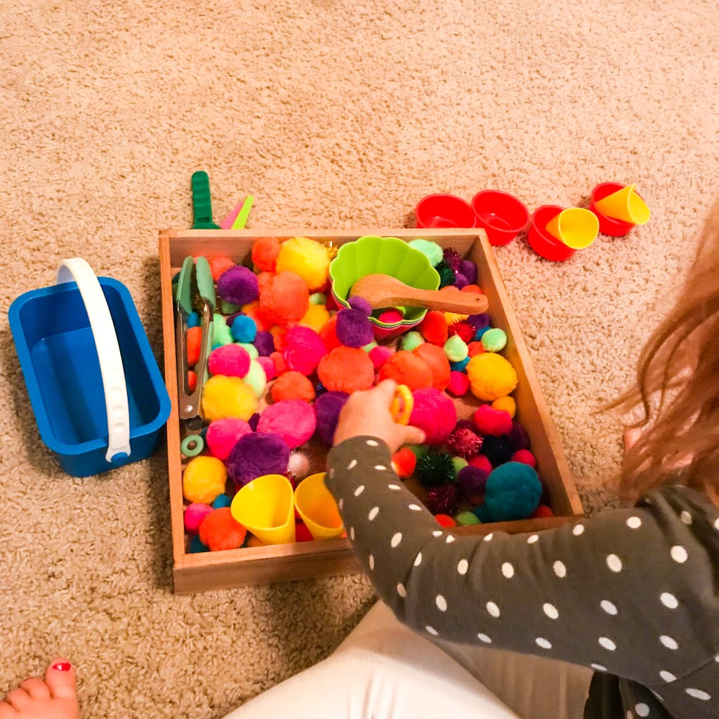 I love sensory bins, the simpler the better! Pom poms and this cute ice cream set from Ikea is the quickest little sensory bin set up ever! Pom poms are one of my favorite fillers to have on hand. They are easy to store, don’t make a lot of mess, they come in tons of colors and sizes, and they can be used in so many activities!