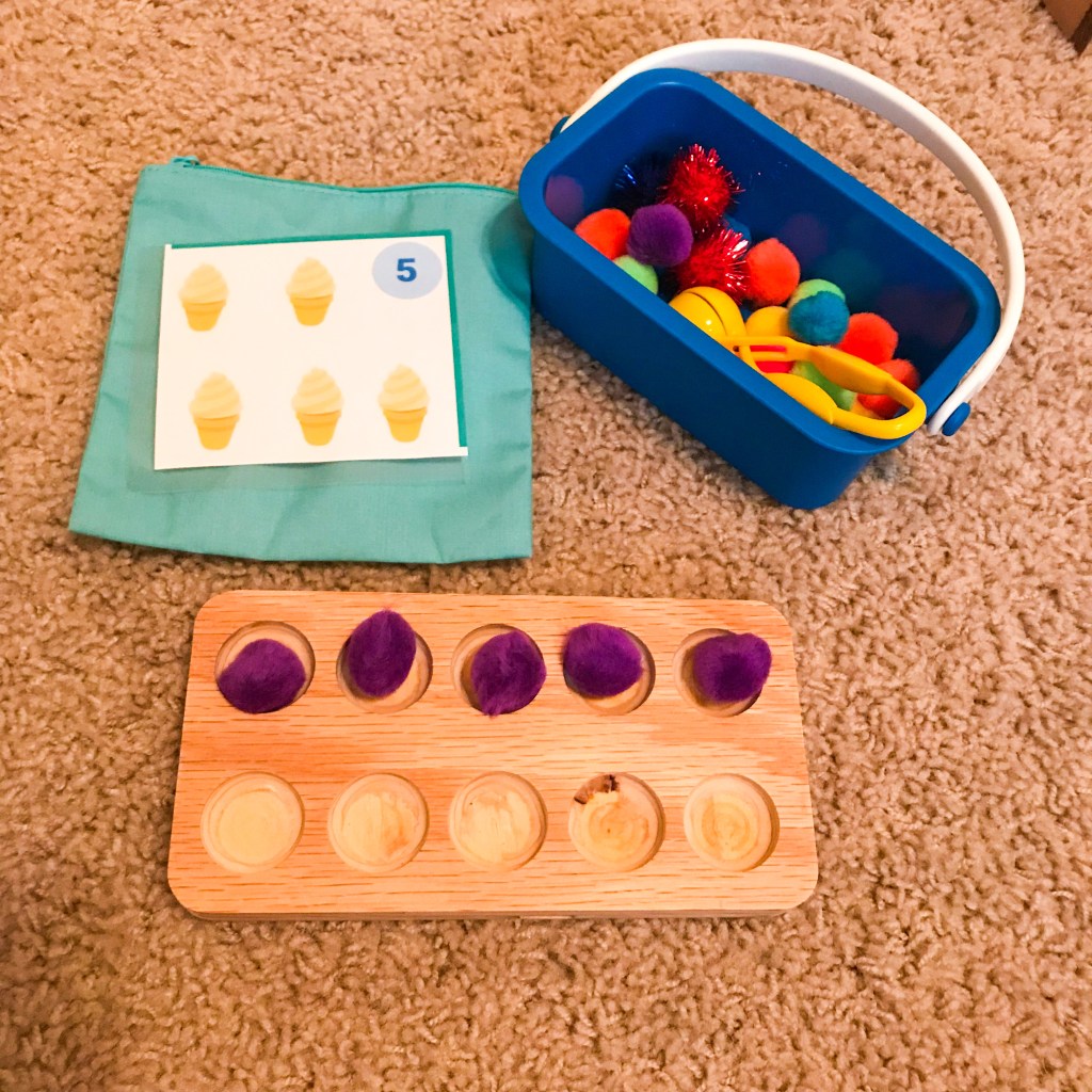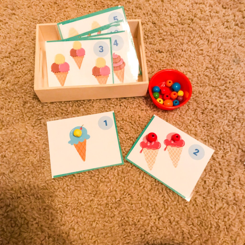 My oldest charge (She will be four in Sept.) is beginning to understand counting, one to one correspondence, and number sense. I made these ice cream themed counting cards for 1-10. In this picture, we’re using beads for counters but you could use mini poms for this as well! If you have young toddlers, use something that you’re comfortable with.