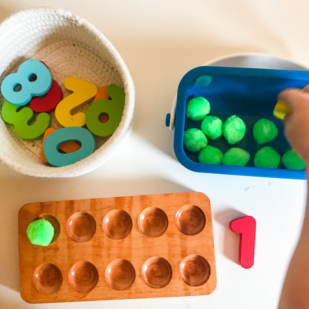 You can also place 10 counters in a basket (or in the reverse side of our board!) and ask your child to fill a specific number. This is also a fun way to work on patterns and matching.