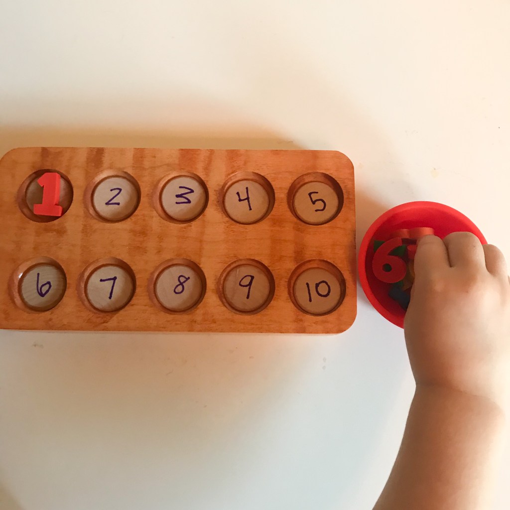 After we’ve mastered these two skills, we move onto isolating numbers. I will fill up a container with 10 counters, a set of numbers or number cards, and a fine motor tool. I will ask the child to pull a number from the basket and then fill the frame. This works on number recognition along with one to one correspondence plus an extra fine motor challenge.