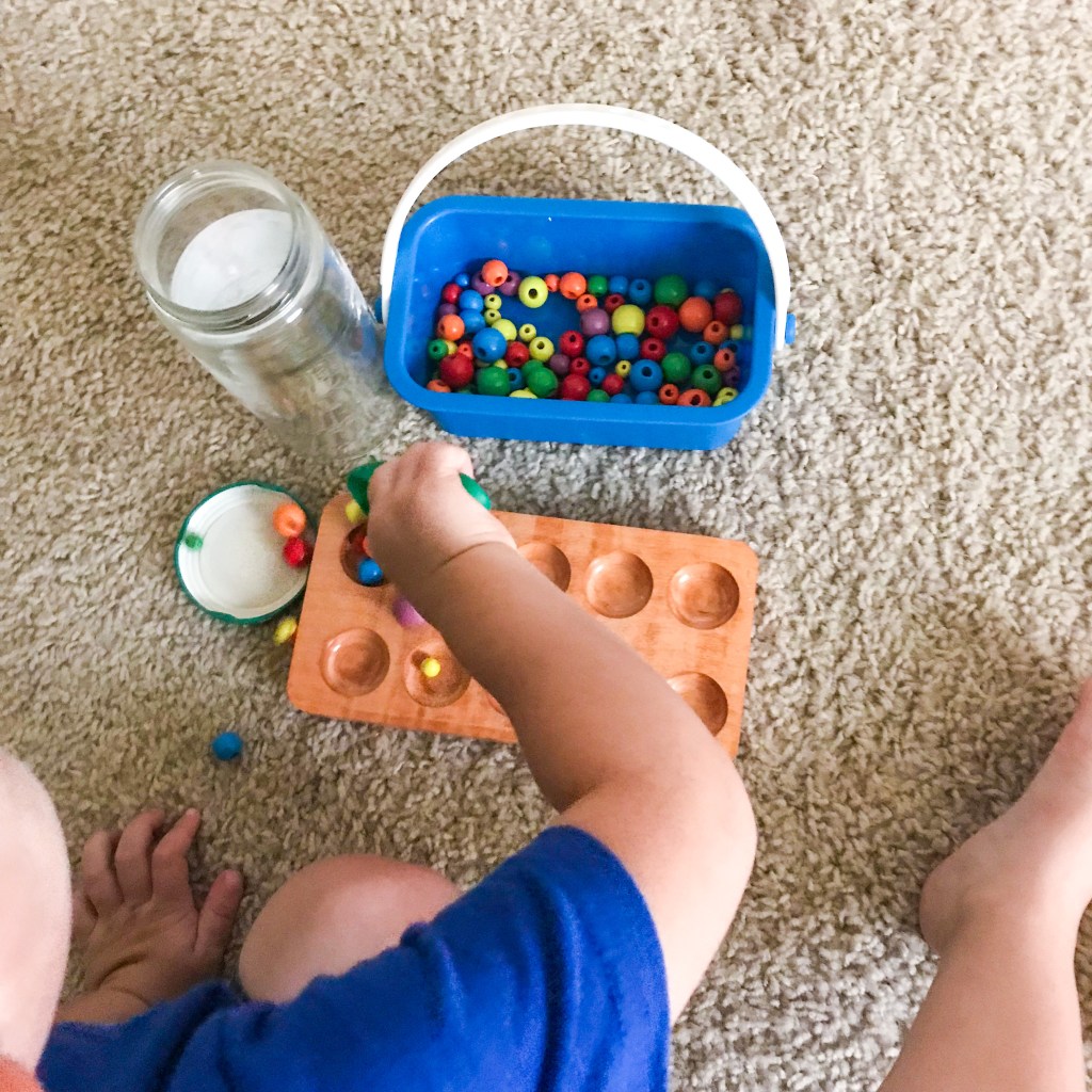 After pom poms, we move on to beads or other sensory fillers. This is a fun way to incorporate fine motor skills like scooping and emptying.