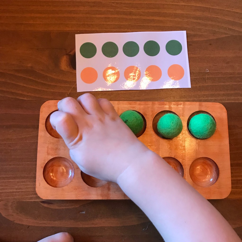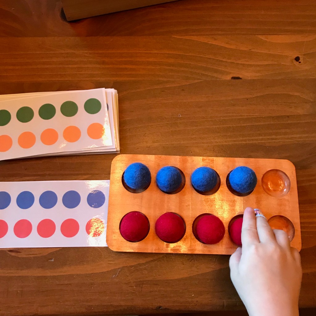 I put this page together in our active learning journal as a starting point! Simply give the child the color poms or balls needed to finish each frame. You could start by matching the picture first and then moving onto filling the frame. My oldest charge mastered these set ups pretty quickly so I made a printable for added practice. These are available in our shop as a digital download!