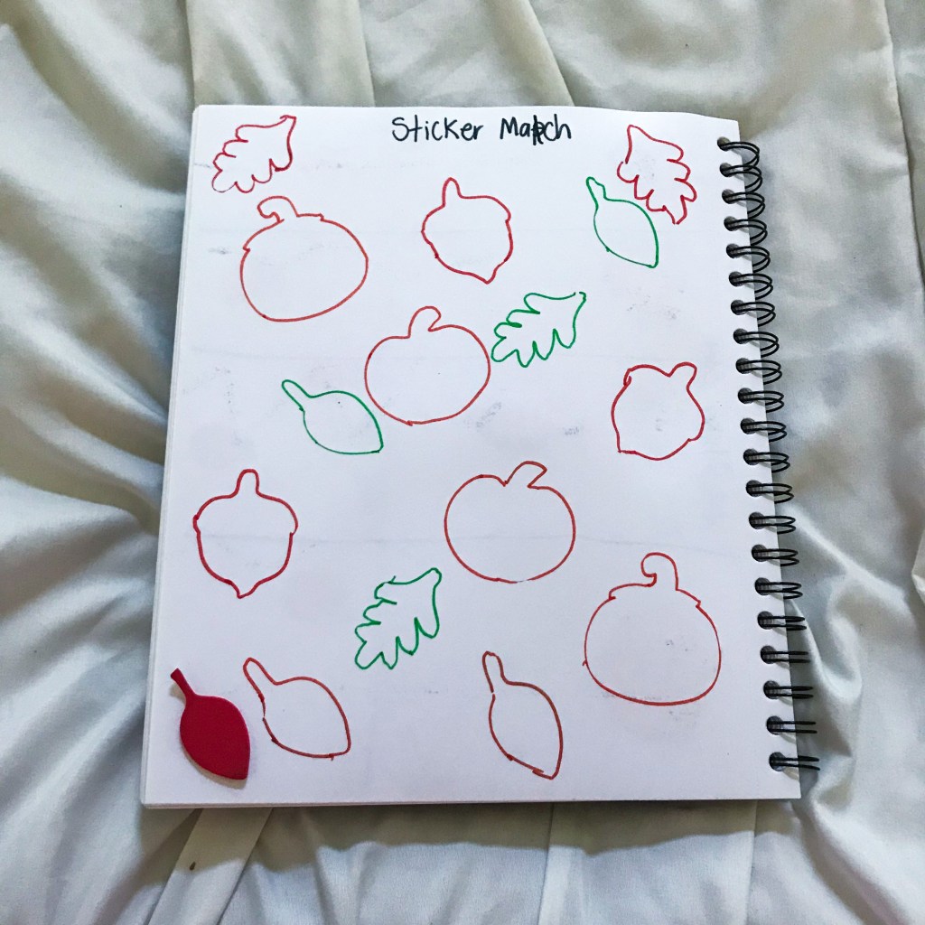 Do you have a toddler who loves a challenging puzzle? I traced a few different types of leaves, acorns and pumpkins in certain colors. I pulled out just the stickers we need to limit frustration levels. My 4 yr old will match the shapes and colors while the 2 yr old will probably just match shapes. I’m not sure if we will put the stickers on the page yet!