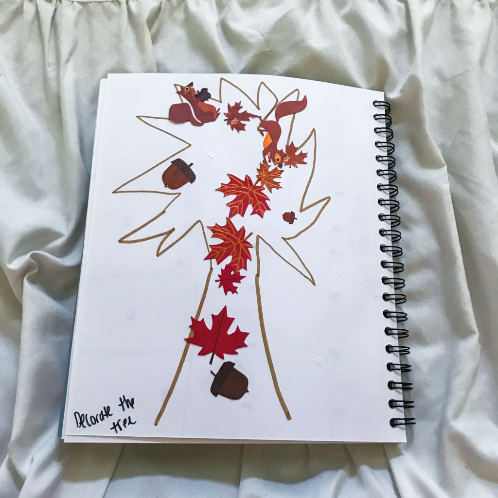I quickly threw together this page after I found some cute fall die cuts from my scrapbooking days! My 4 yr old had the most fun telling a story about the squirrels while she glued! You could easily cut out some leaves or use stickers.