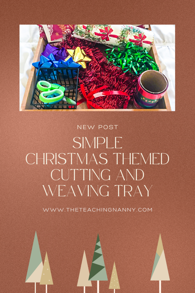In my quest for simple this Christmas season I pulled together a ridiculously easy cutting and weaving tray for my charges! If you asked E, my 4 year old charge, she would tell you that she doesn’t get enough chances to use scissors. I would tell you that up until the last few months her fine motor skills weren’t quite ready for tons of scissor work!