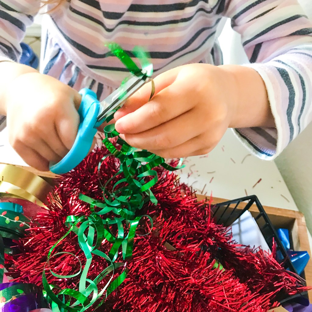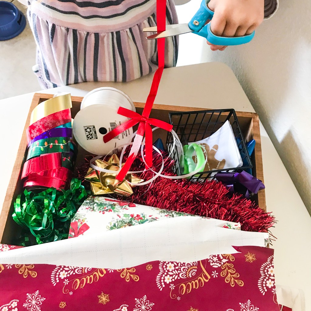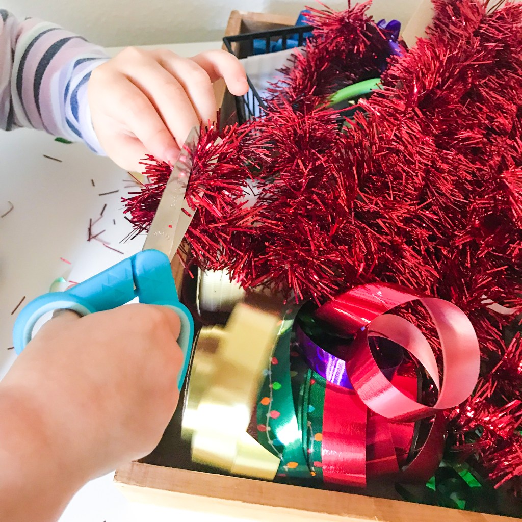 Christmas is the perfect time to throw together this cutting tray because we all have left over scraps of wrapping paper, ribbons and bows lying around! Add them to a box or empty basket, add some scissors and let your kids go to town!