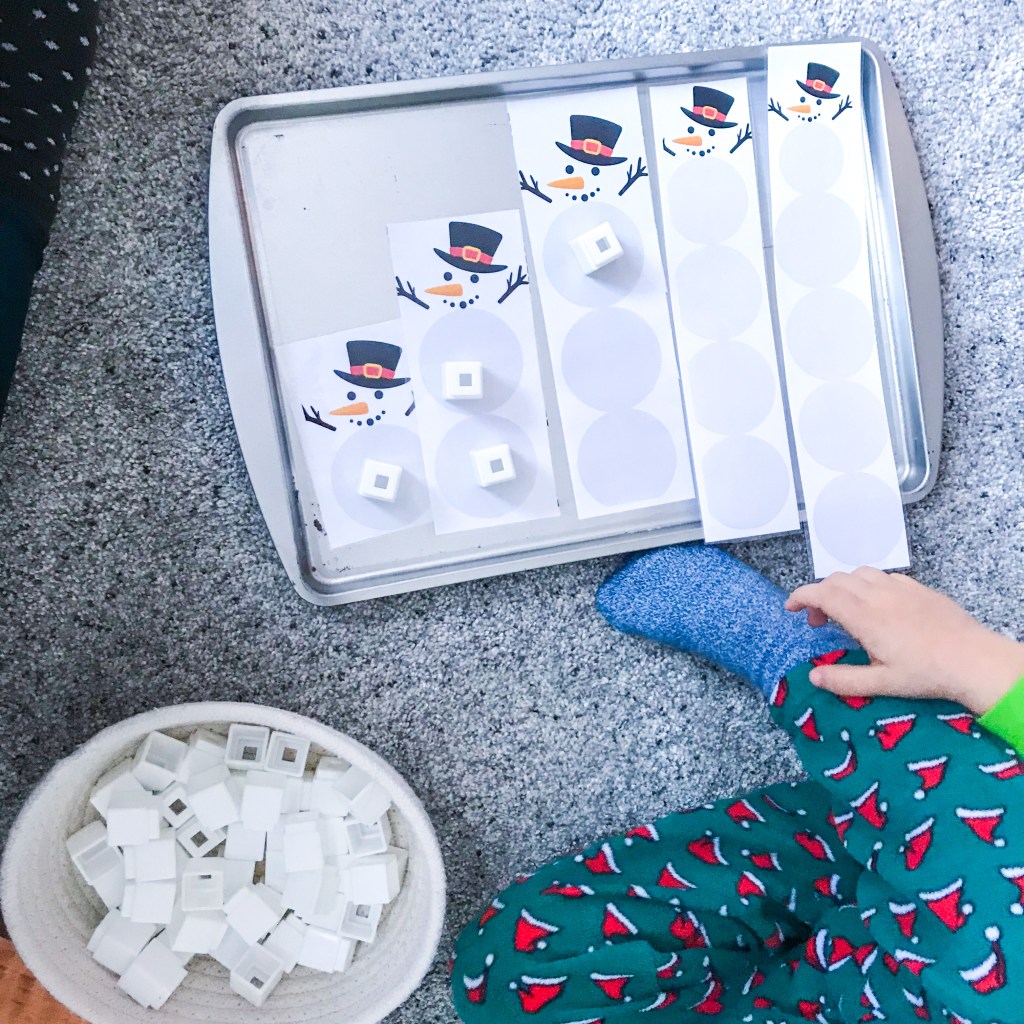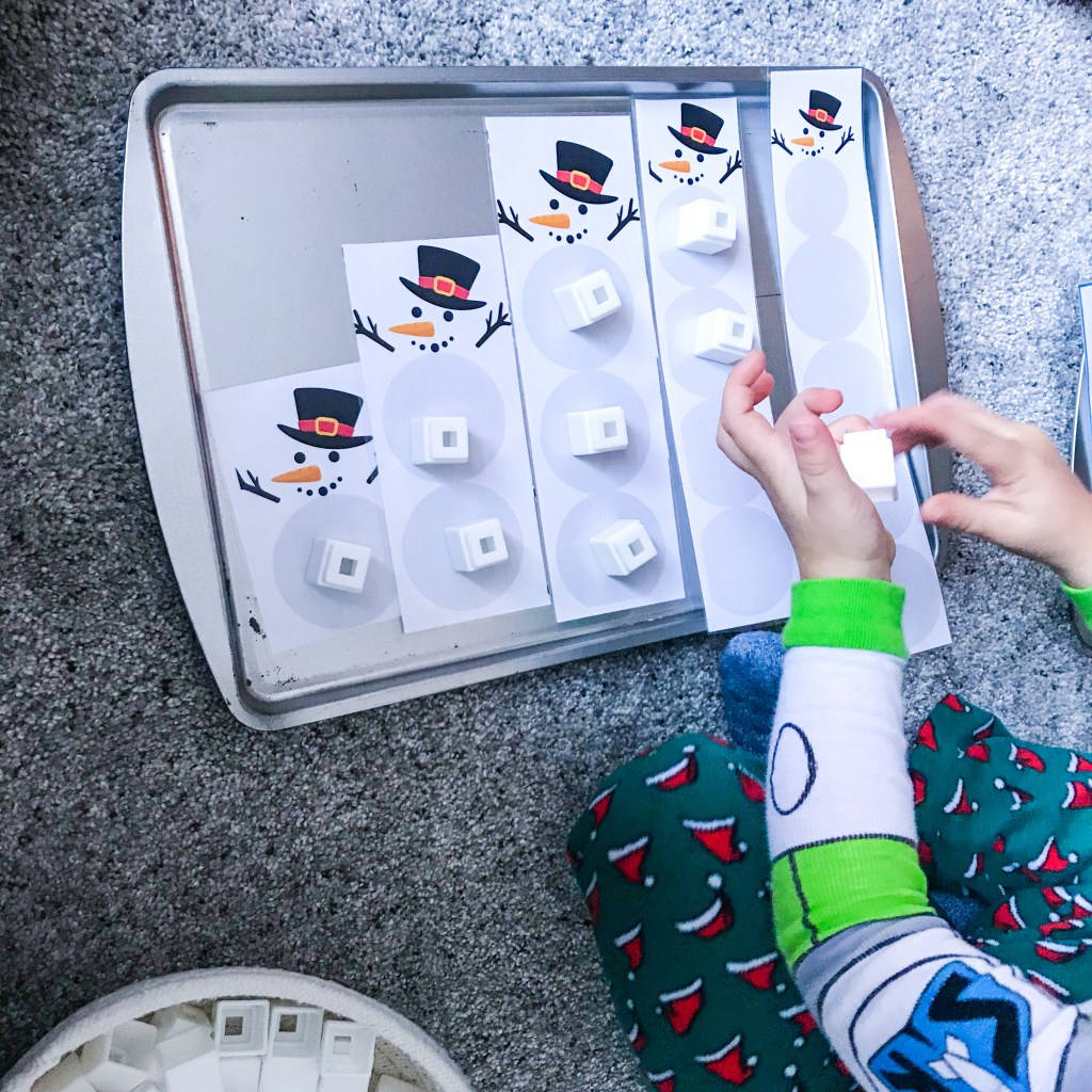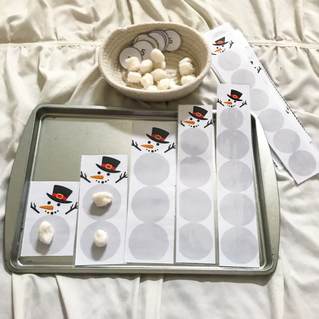 This cute snowman printable includes the snowman from numbers 1-10. There are also small number circles for your child to match. Once the snowmen are cut apart and assembled, have your child build by counting out a white pom pom or other white counting tool on each circle. Have him use the number circles to match each snowman.