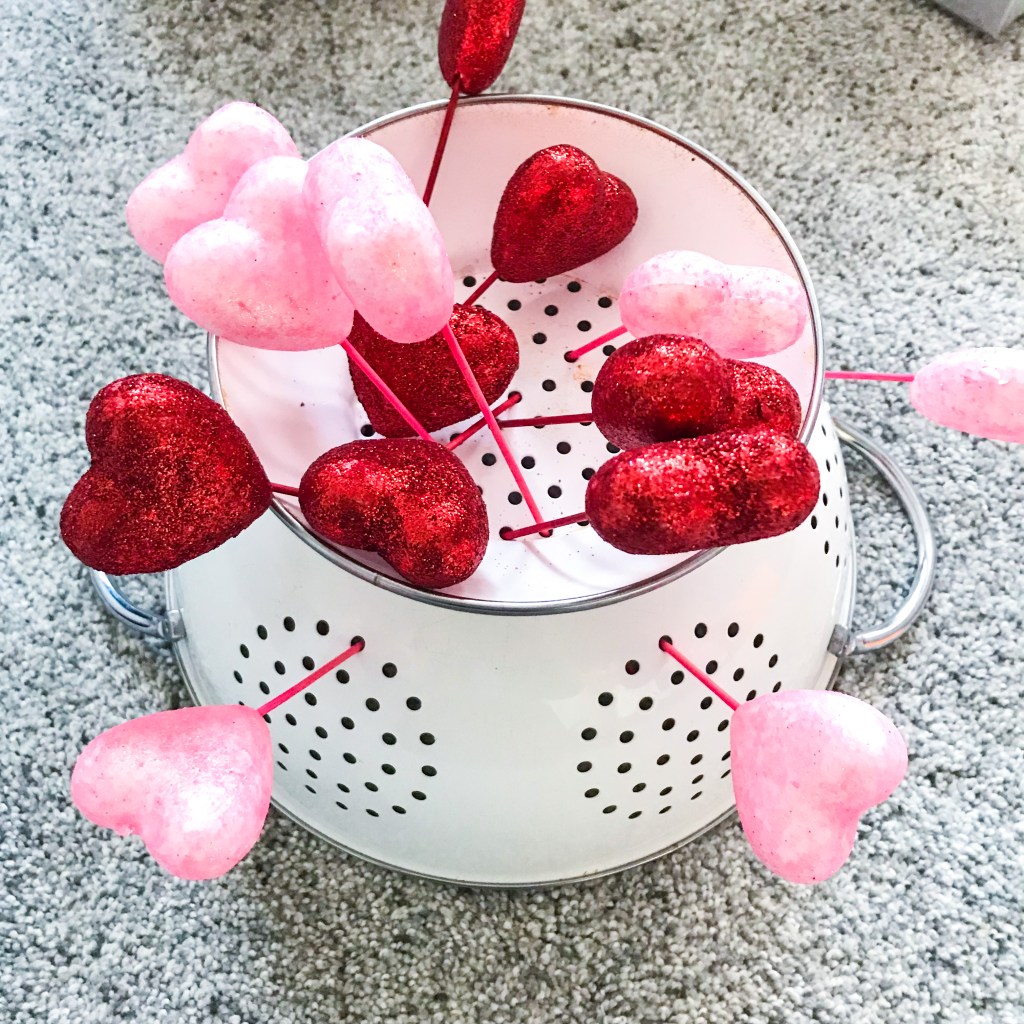 Valentine’s Day decor is severely underrated! Look for some heart picks at dollar tree to make this easy fine motor colander. Have you child pull the hearts and then place back into the holes.