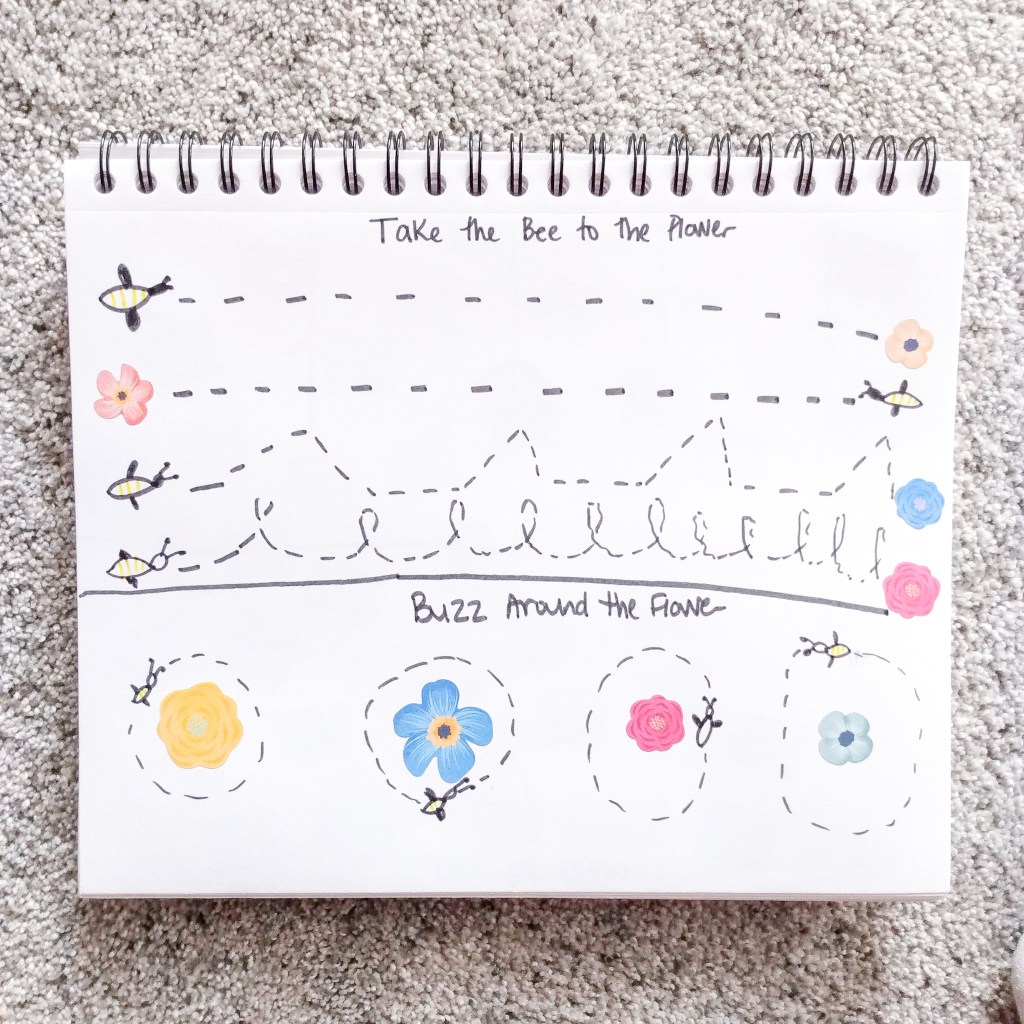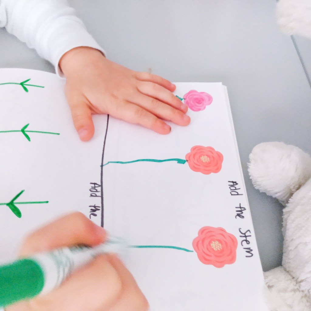 Another pre-writing page that can be created for whatever level your child needs. Place stickers where you would like and have your child add stems. On the bottom page, let your child explore his or her flower drawing skills!
