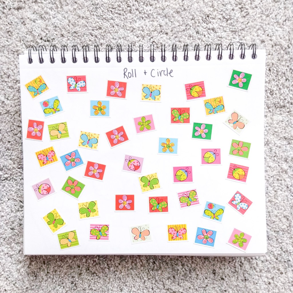 This page mixes pre-writing and math! Using a dice, have your child roll, count, and then circle the correct number of stickers. For older children you could use two dice for addition practice. Your child can circle individual circles if you’re working on one to one correspondence. If you want to work on grouping, have your child circle each group.