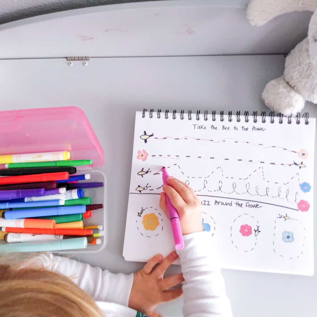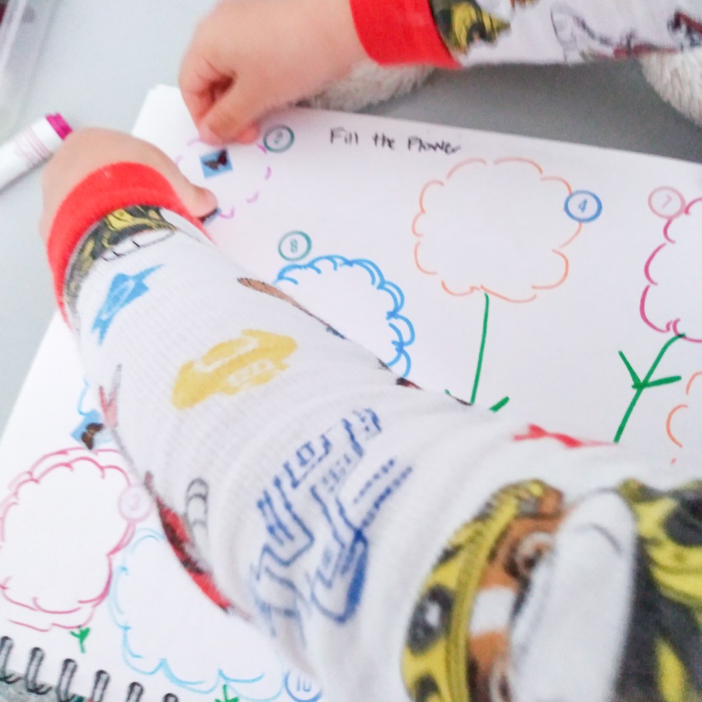 I’m really proud of this grouping, fine motor, one to one correspondence page! It’s so easy. Draw a few flowers. Add numbers you want to work on (I happened to have number stickers lying around, you don’t need them!) Have your child fill each flower with springy stickers!