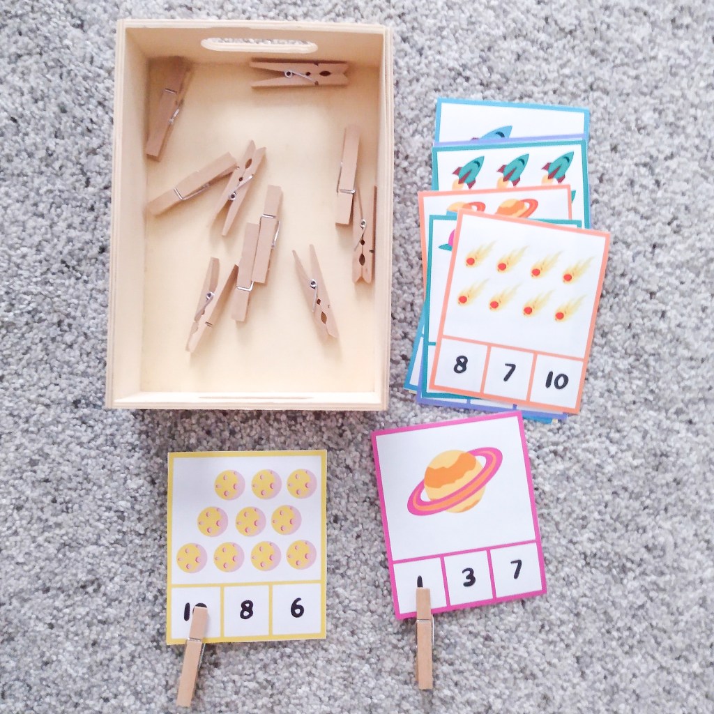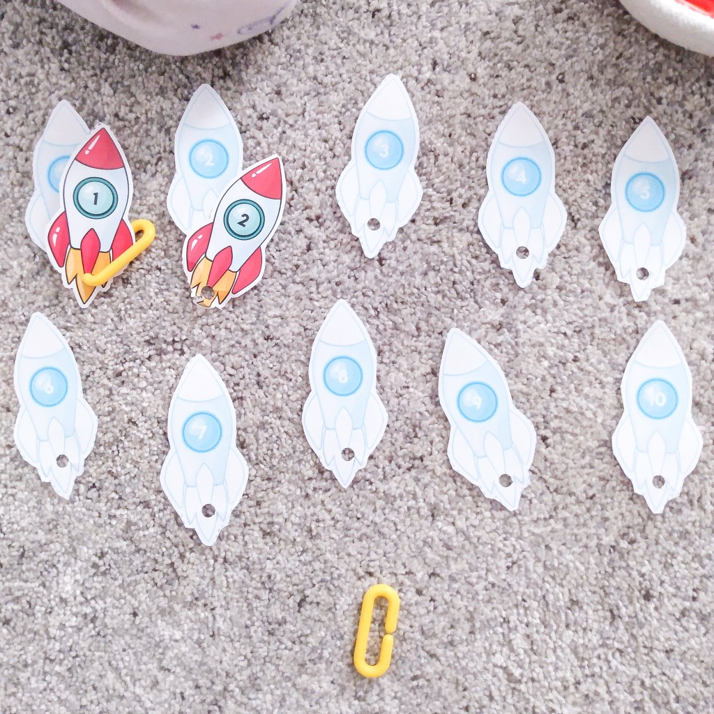 My youngest charge loves counting so these rocket counting cards can be turned into a fun linking activity. We pretended the red and yellow links were the fire coming out of the rocket. You could print off two of these pages and make this a matching activity as well.