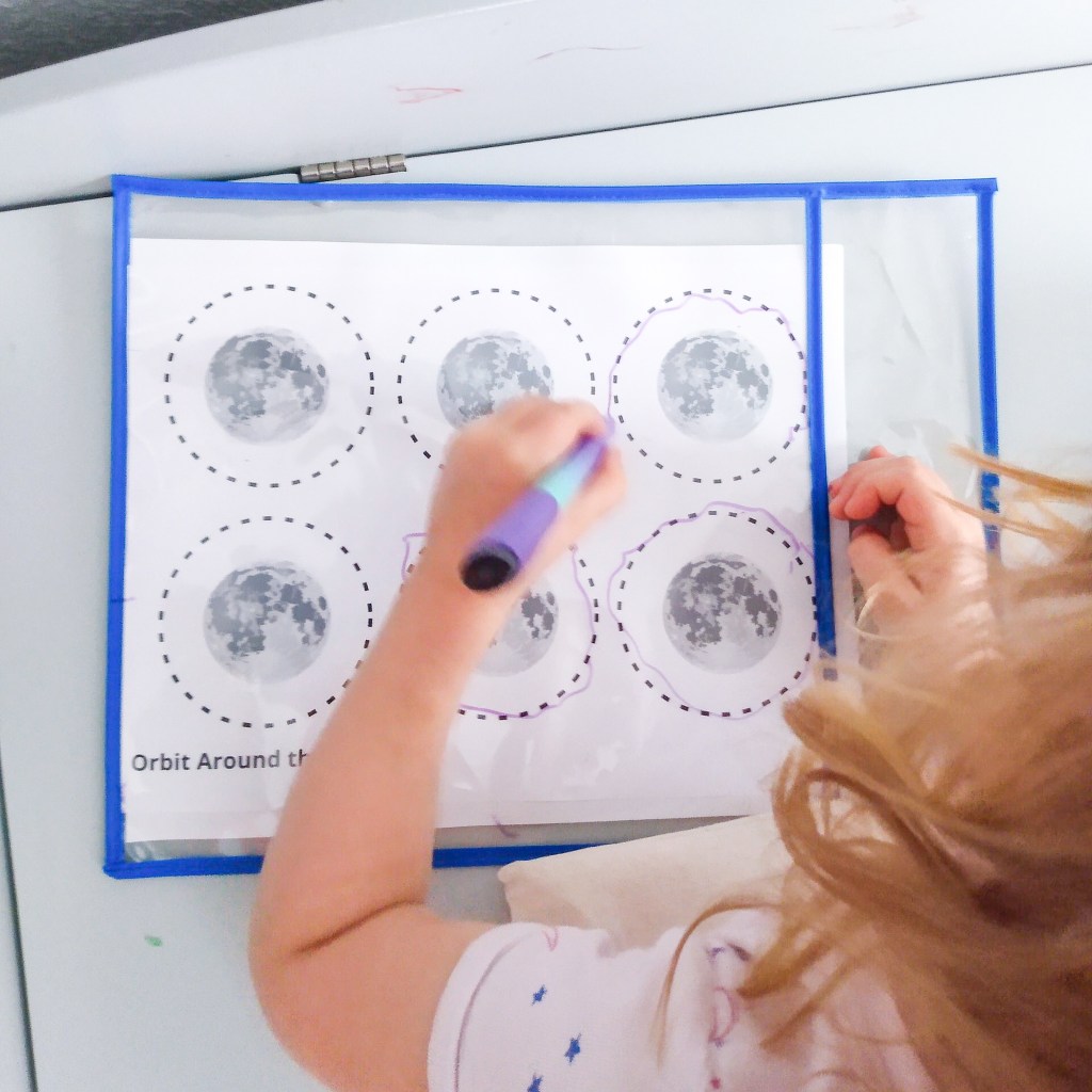 My oldest charge has been working hard on fine motor skills! I created a fun orbit around the moon page for a simple tracing activity.