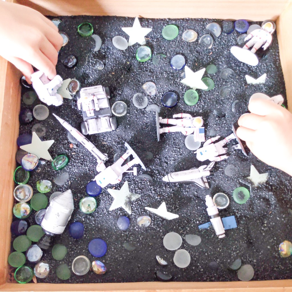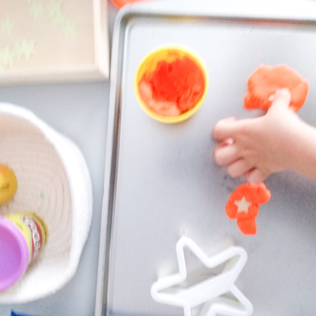 Playdough is always a winner with these kids! We added a few stars and star cutters. You could also make some galaxy themed dough if you wanted!