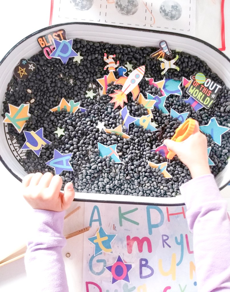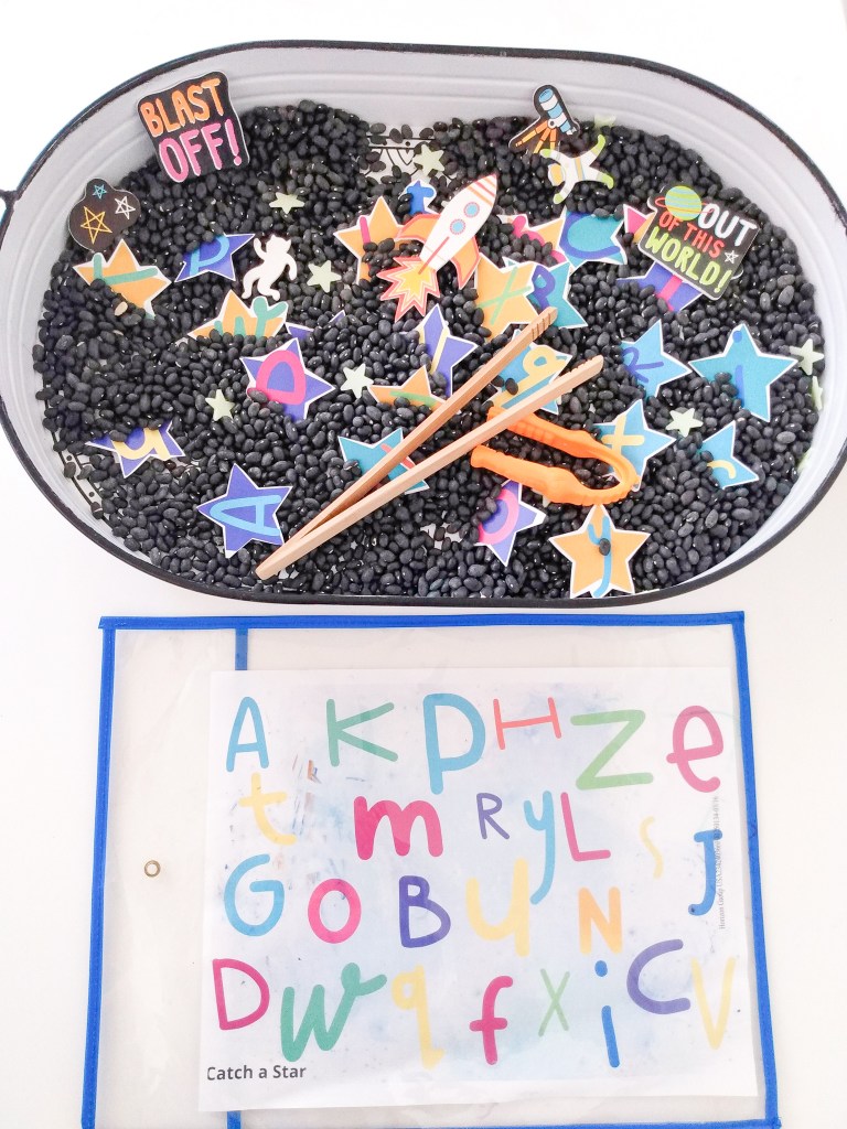 You can easily add black beans or black sand to a pan, add some letters either cut out or printed on stars, and give your child a sheet with the alphabet to match!