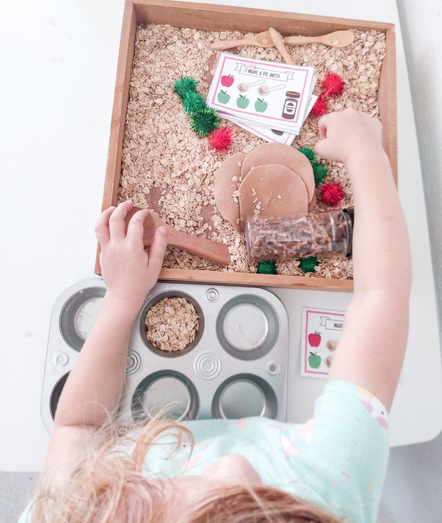 Last year I had added some apple pie spices to old oatmeal which we used again, along with a cupcake tin, small plastic containers, scoops, felt pie crusts, and the cutest cinnamon shaker prop! I made some recipe cards (printable available at the end of this post) for the kids to make their own apple pies.