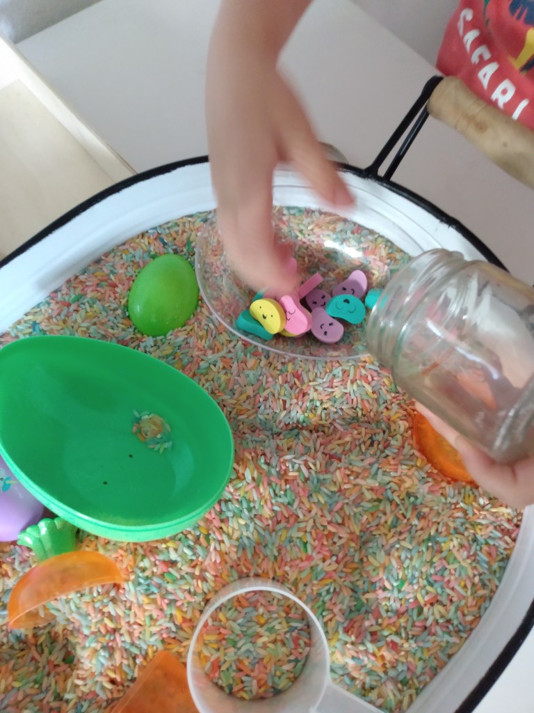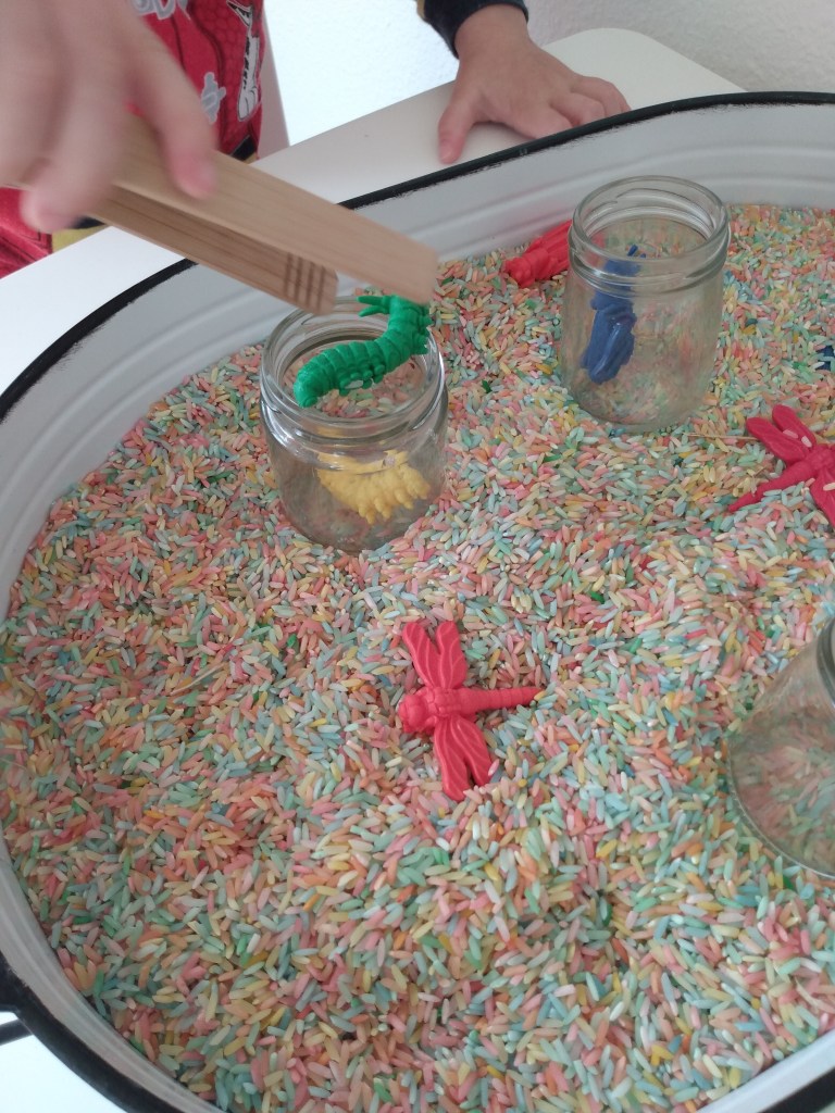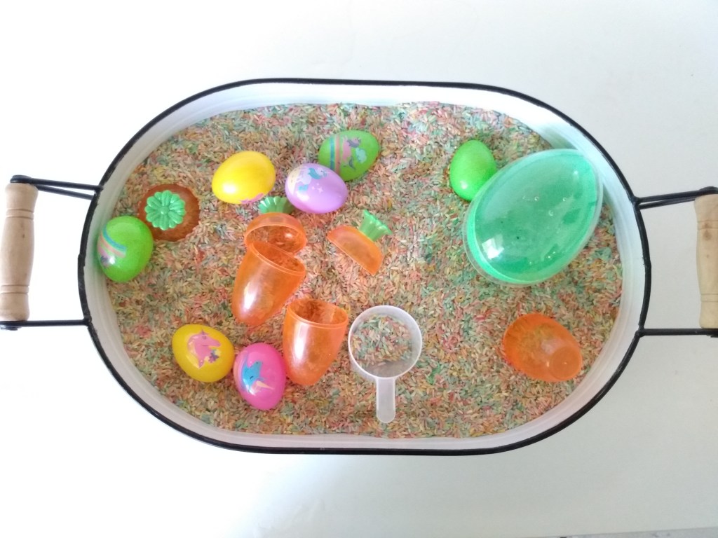 Our first offering in this series is all about sensory play using the time tested Rice Bin!