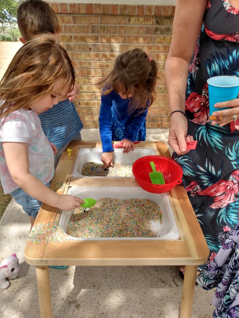 - Tools and toys: measuring cups, spoons, small shovels, funnels, plastic animals, or cars
